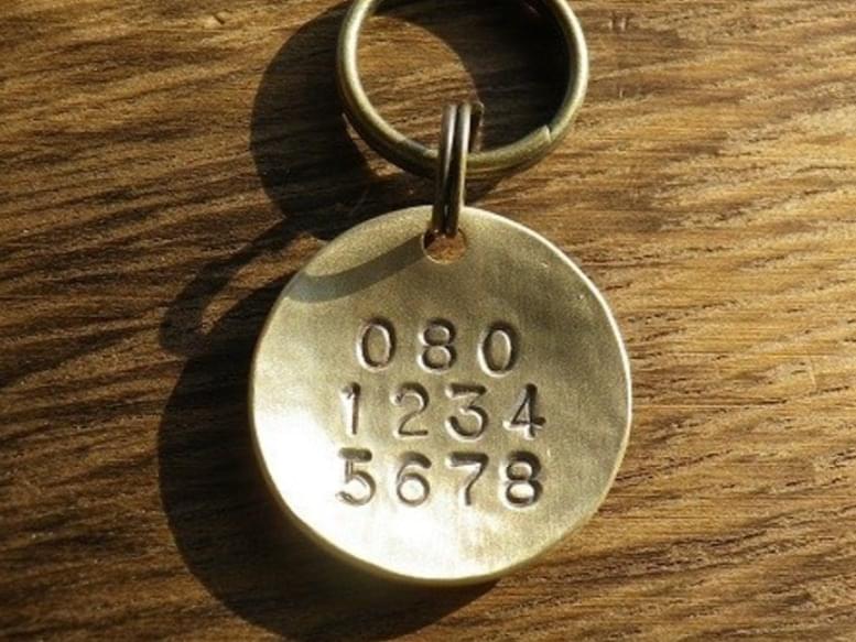 首輪(ベージュの細い紐)に真鍮の名札をしています。