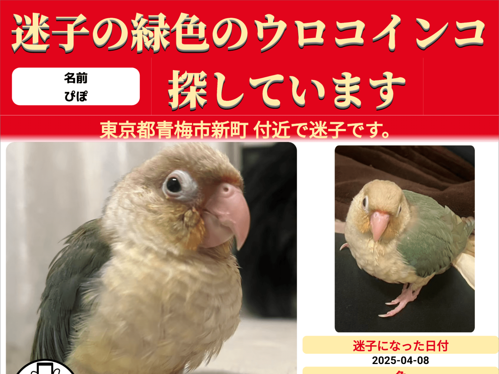 ホーム迷子鳥東京都緑色で目の周りが白い…緑色で目の周りが白いウロコインコパイナップル管理編集するポスター掲載終了最終更新日時:2025/04/11 17:17写真情報用件迷子名前ぴぽ性別不明年齢0歳場所東京都 青梅市新町発生日時2025年4月8日(火)飼い主永田説明まだ小さいのですぐ迎えに行きたいですお願い致します0連絡先URL未設定掲示板情報交換のための掲示板です。ユーザーからの情報提供、オーナーからの連絡などにご利用下さいませ。書き込んだ情報は、オーナーのメールに通知されます。コメントを書き込むおそらく関東(都内?)でウロコインコの目撃情報蒼白返信0件2025/05/24 15:17
