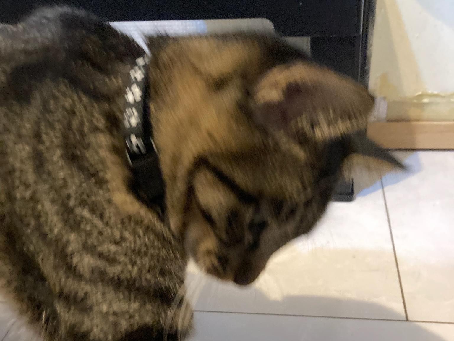 脱走時は黒の猫の足跡柄の首輪を付けてました。