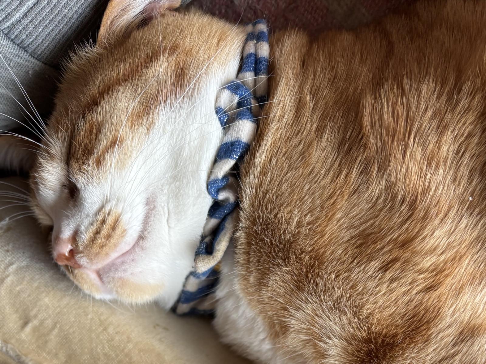脱走時に水色と白色のしましま柄のシュシュ型の首輪をしていたはずです。