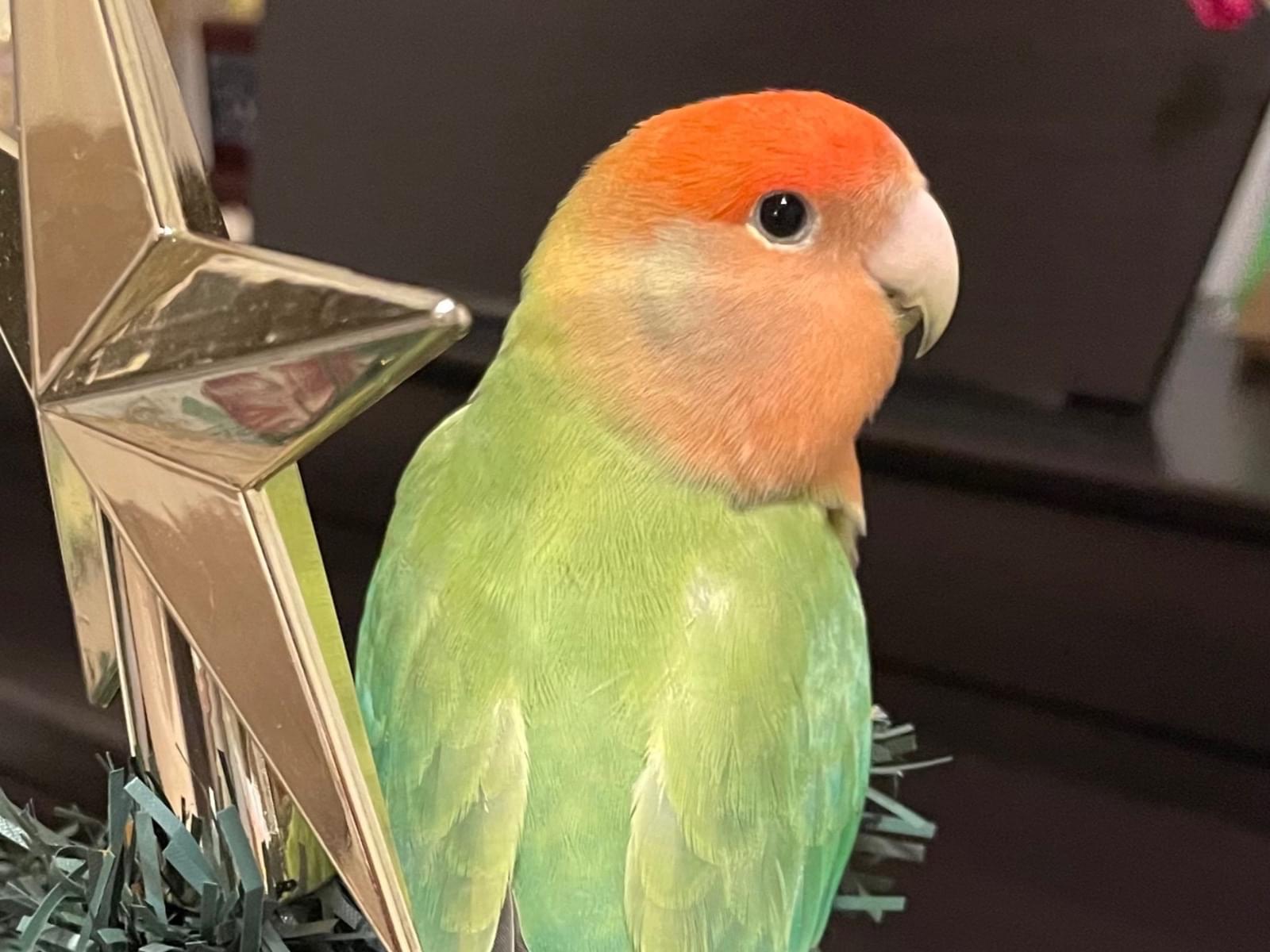 全体の羽色は緑です。頭から首までは赤色です。一般的な羽色です。