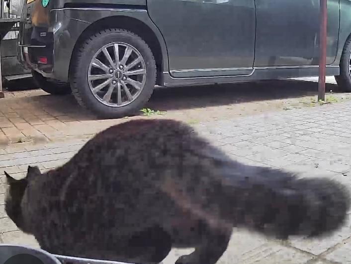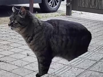 我が家にやって来ました、黒っぽい縞模様の猫さんです。尻尾が長くて立派です。痩せていないので飼い猫さんさもしれませんが、探している方がいるかもしれないので念のため