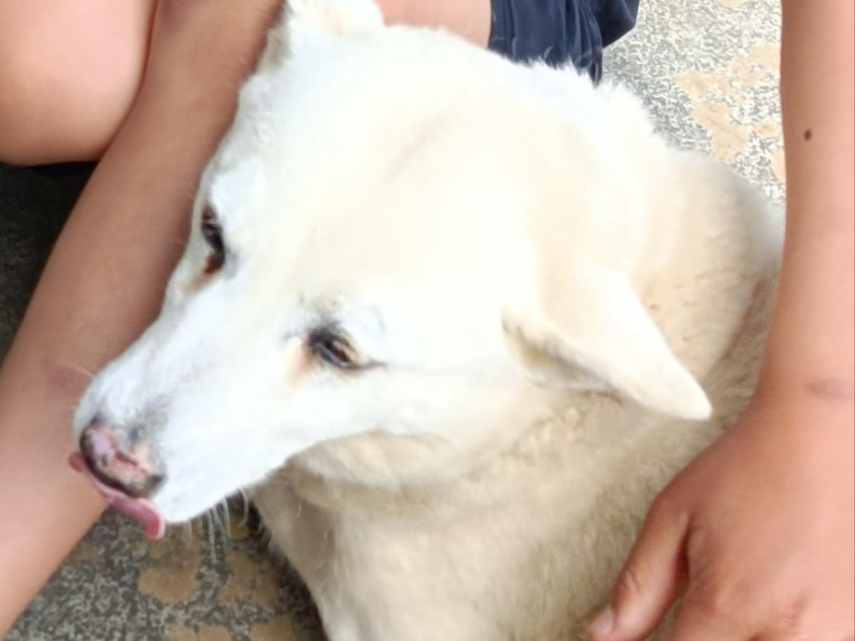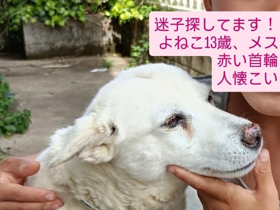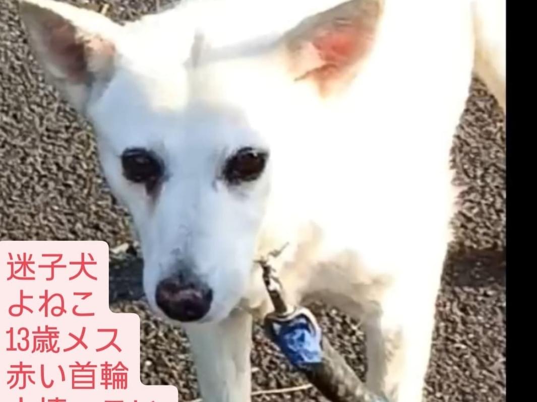 13歳、メス、中型犬、全身白で、目もとが目やにで赤いです。