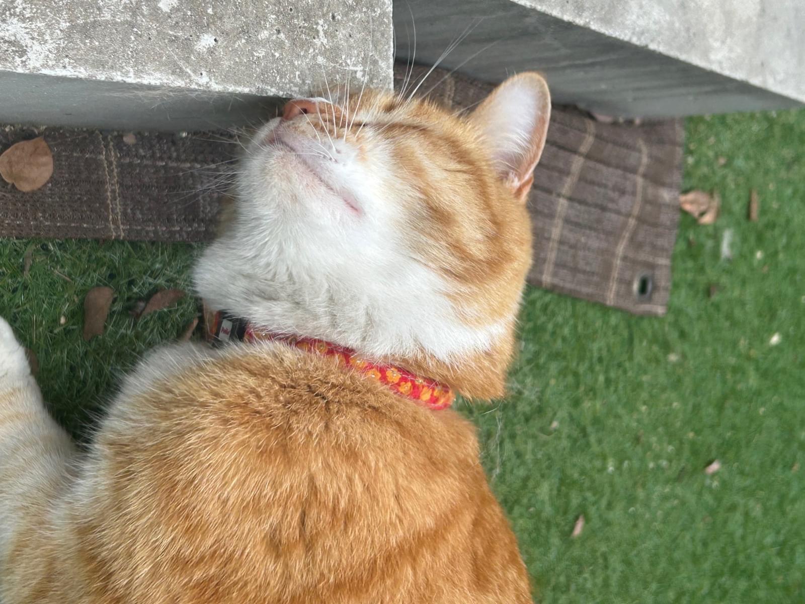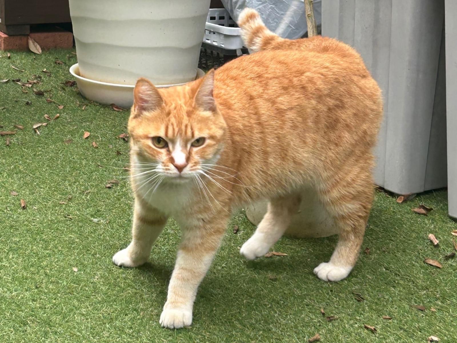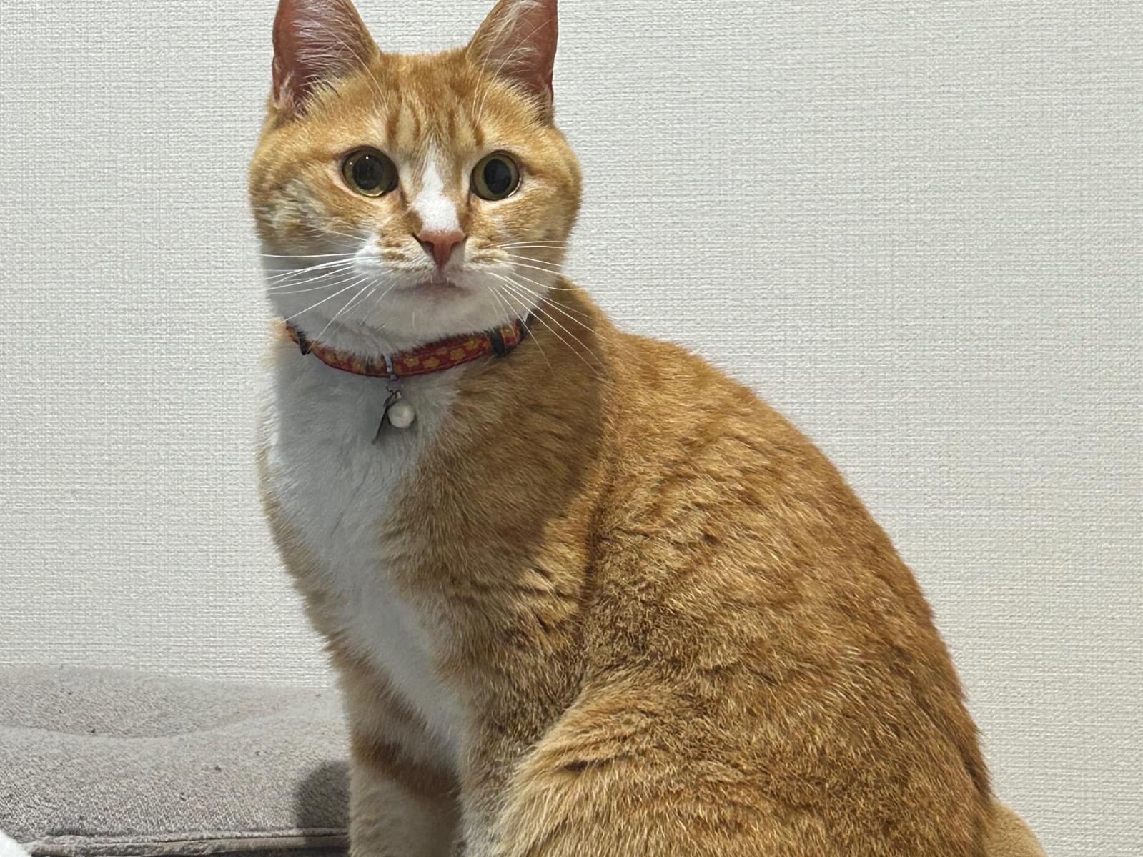 赤い首輪の茶トラメス
