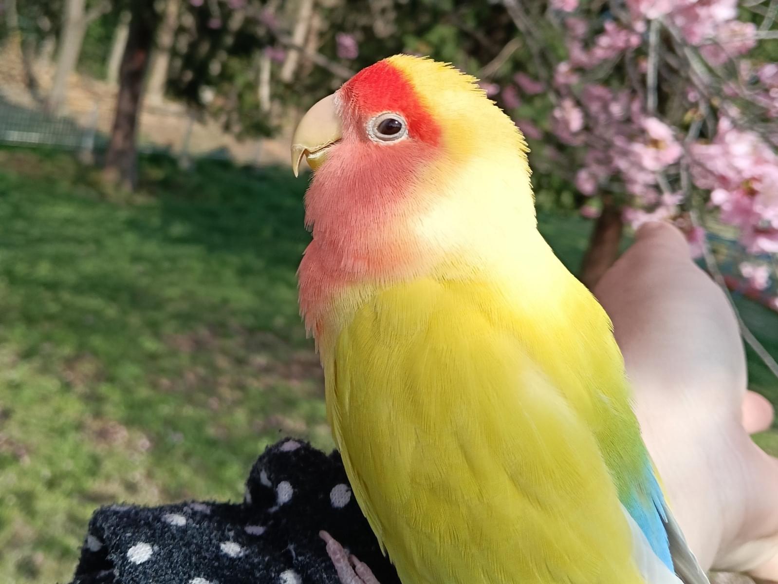 午後3時半頃ベランダで布団を取り込む前に、布団たたきをしたところ、肩に乗っていたインコが驚いて飛んでいってしまいました。いつも私にベッタリの子で布団を干したりこんだりのときは、肩や頭に乗っていたのですが布団たたきは初めて今日やったところ、驚いて飛んでいきました。うちからすぐの木のてっぺんにいるのを発見しましたがおりてこず、1時間半くらいその木に止まっていました。木を揺らせば降りるかなと揺さぶったところ違う方に飛んでいってしまい見失いました。夕方になってしまったので家に帰りましたがもちろん戻ってきてはいません。見かけた方、保護した方是非ご連絡下さい。