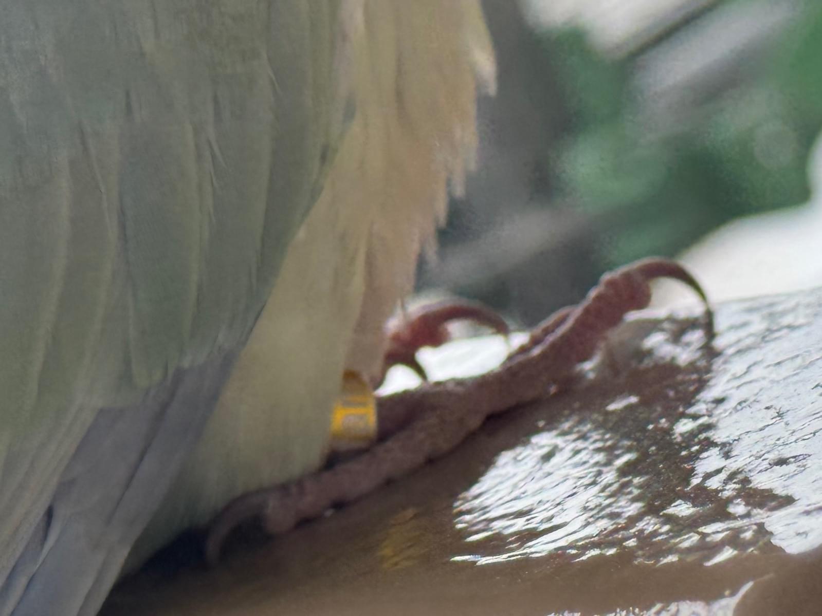 黄緑のインコで右足に黄色の輪っかをつけています。英語で小さく文字が書いてあるように見えましたが、小さく埋もれていて読めません。