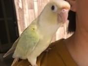ウロコインコのムーンチークという色で、全体が淡いグリーン、尾羽が薄いオレンジです。