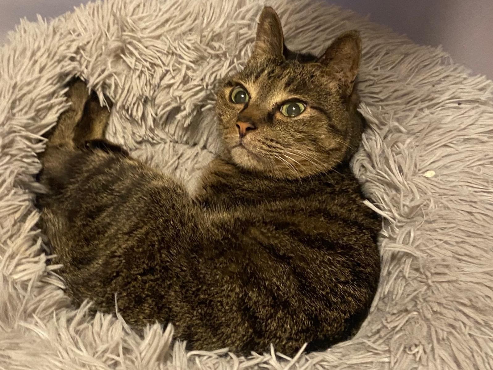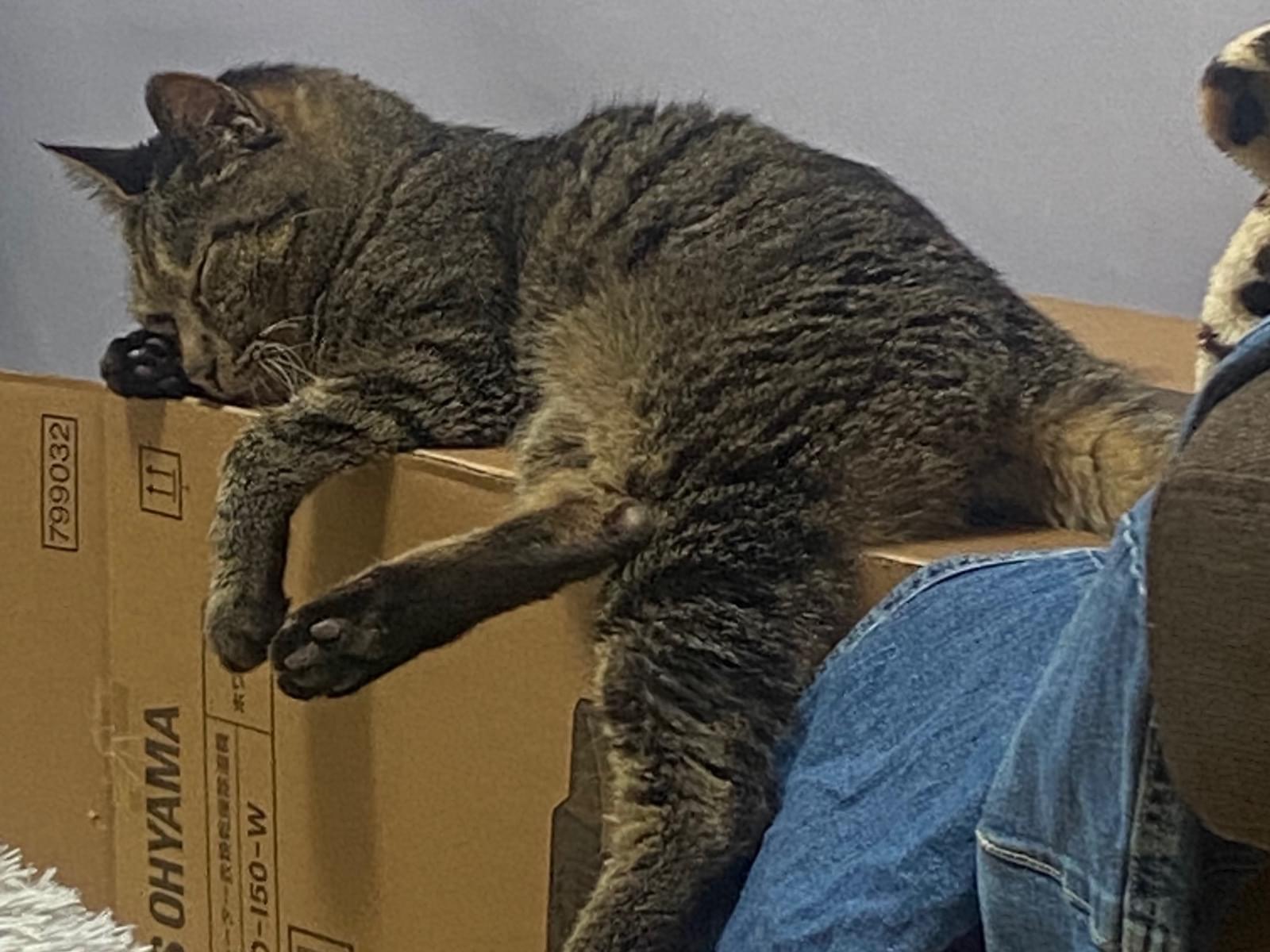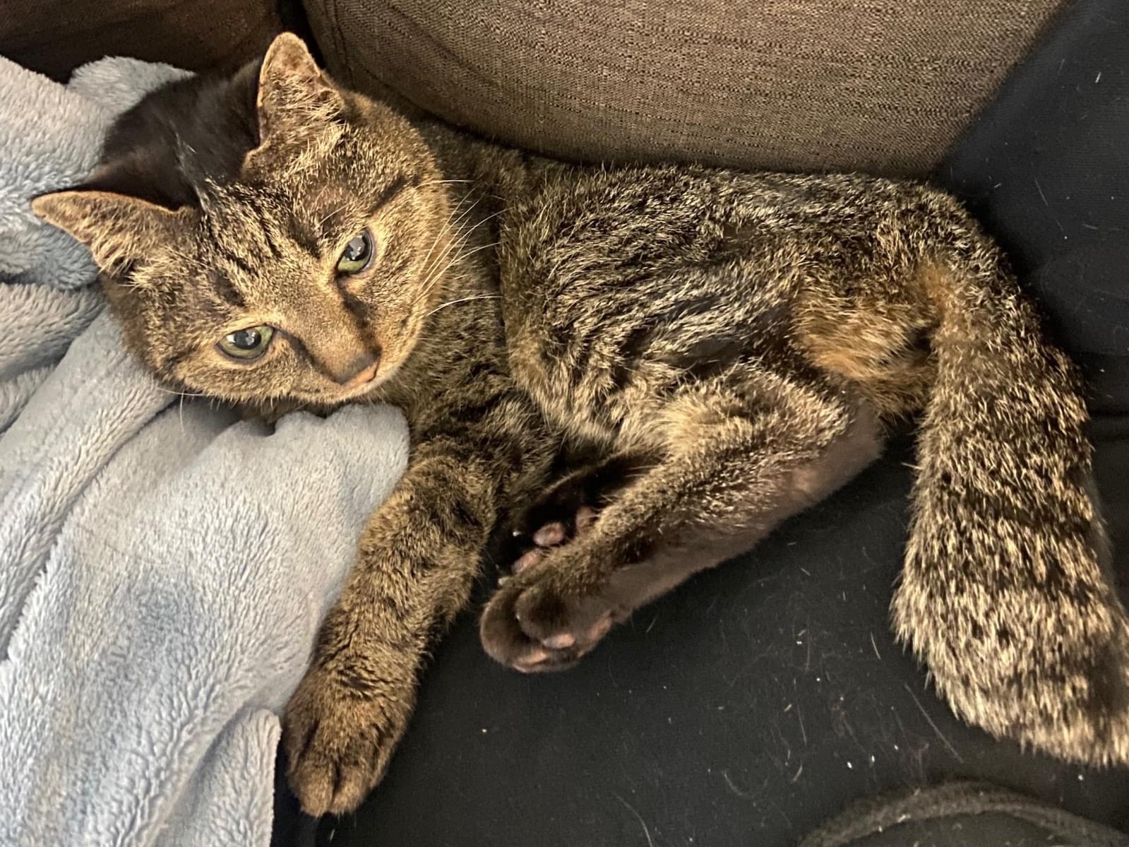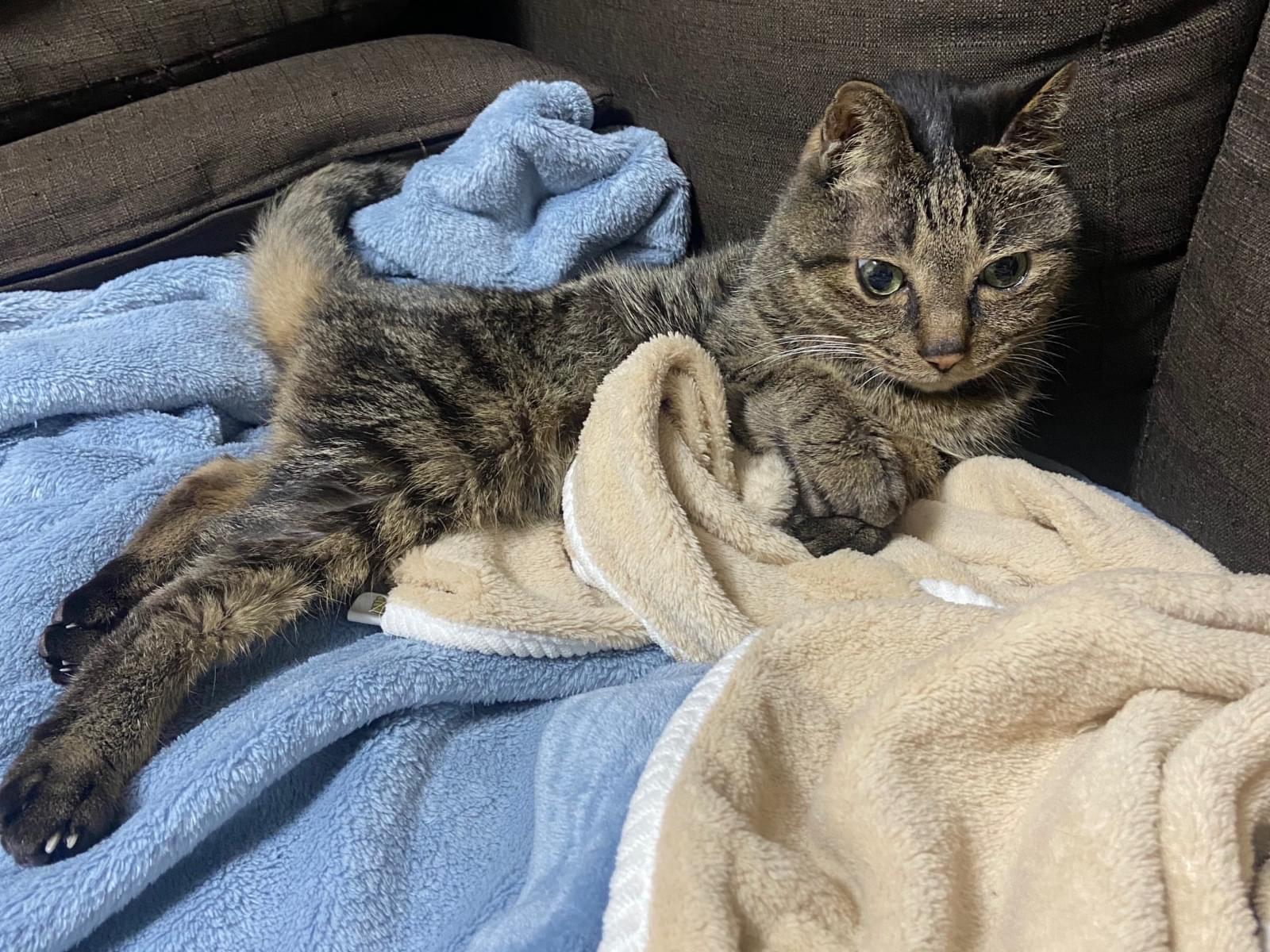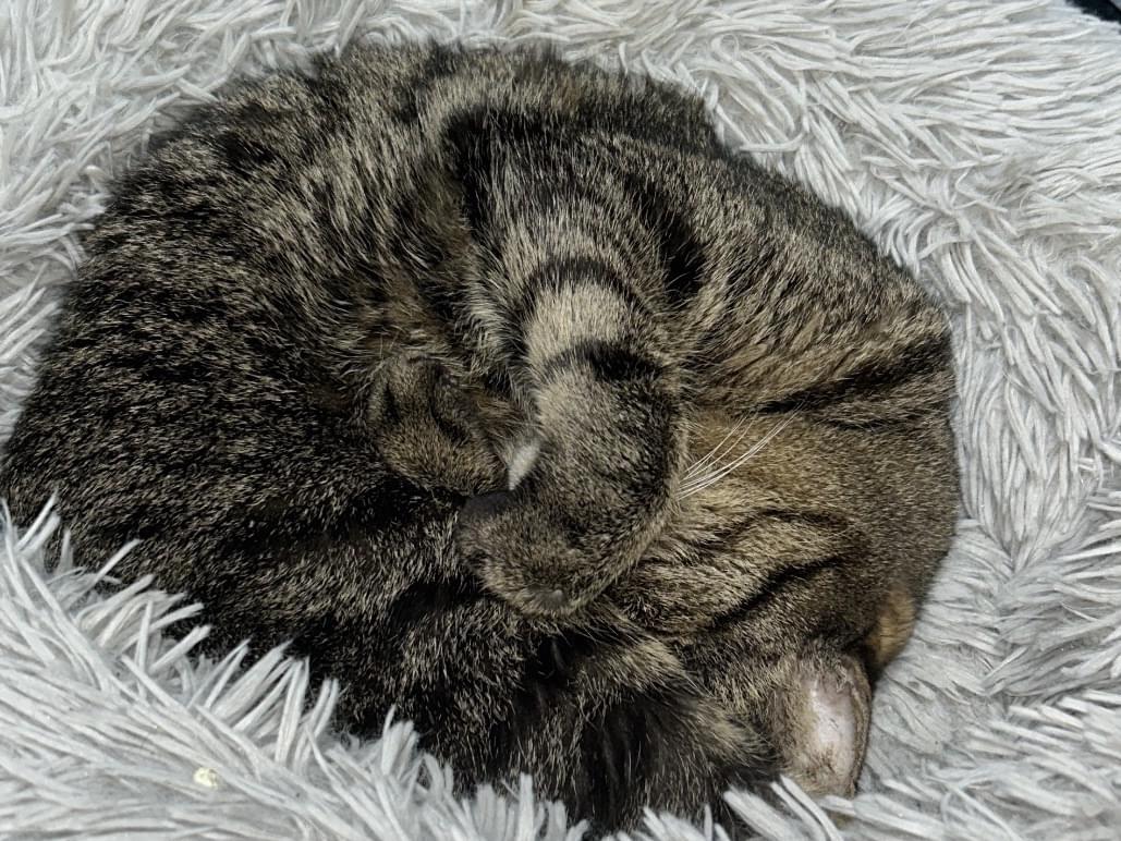 雑種のキジトラで尻尾がカギしっぽになっています。
