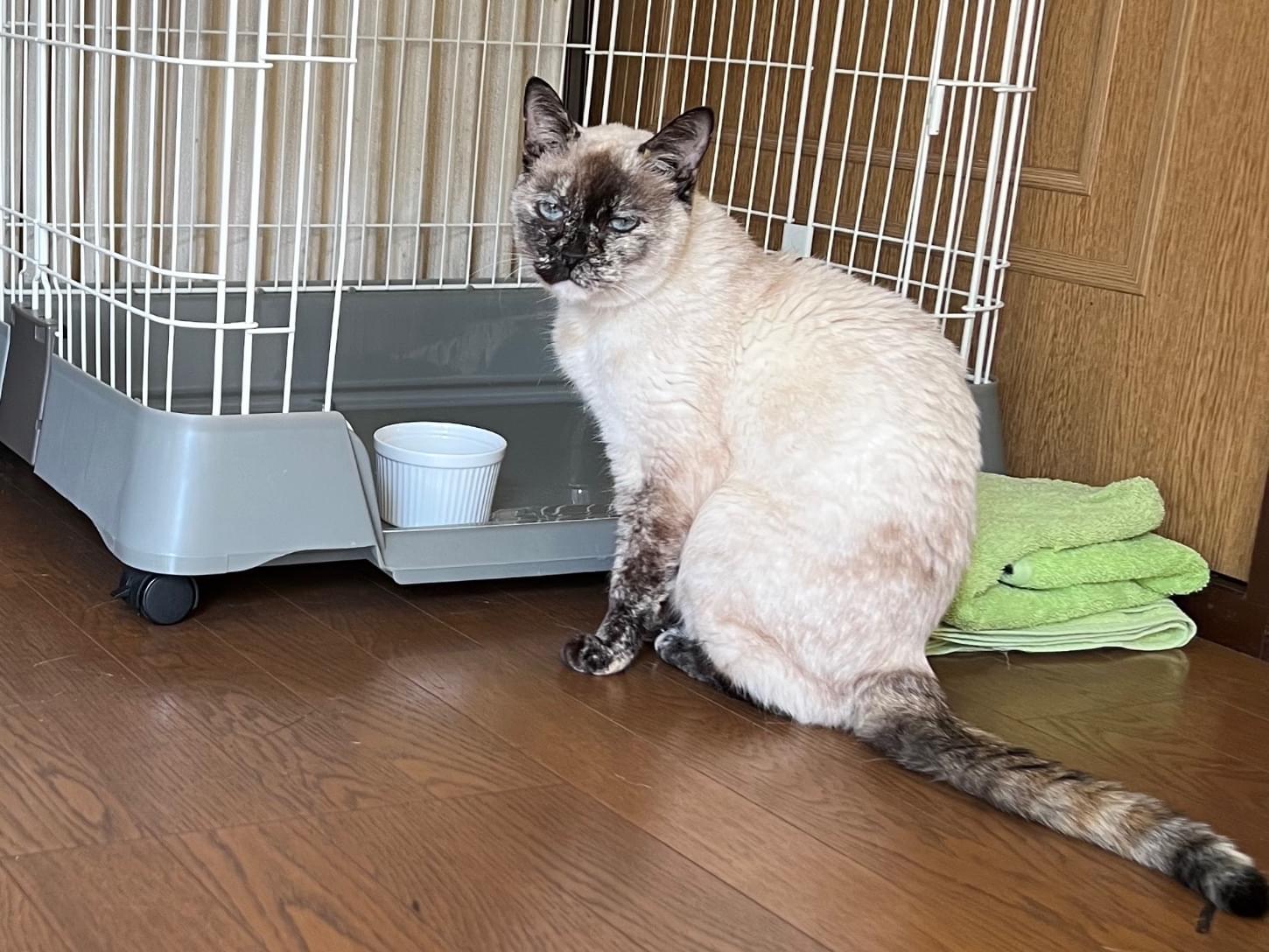 白いシャム柄のメス猫で布製の赤い首輪をつけてます。