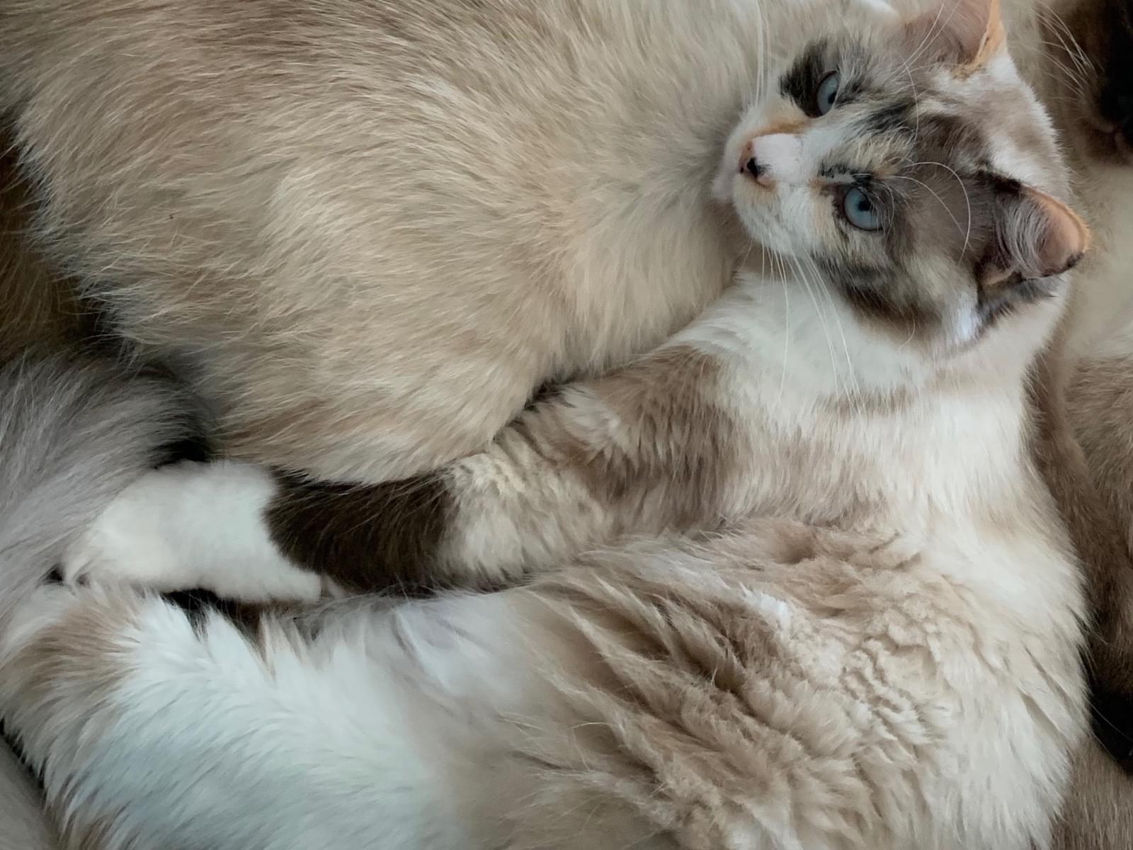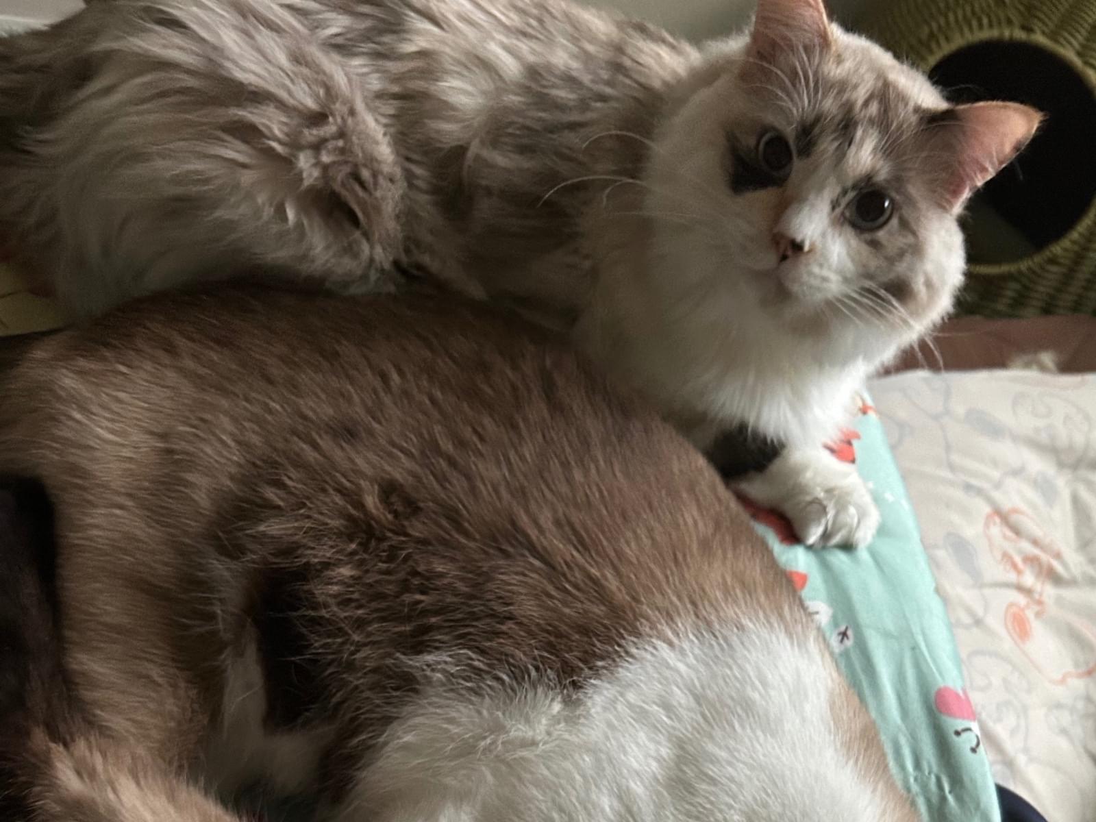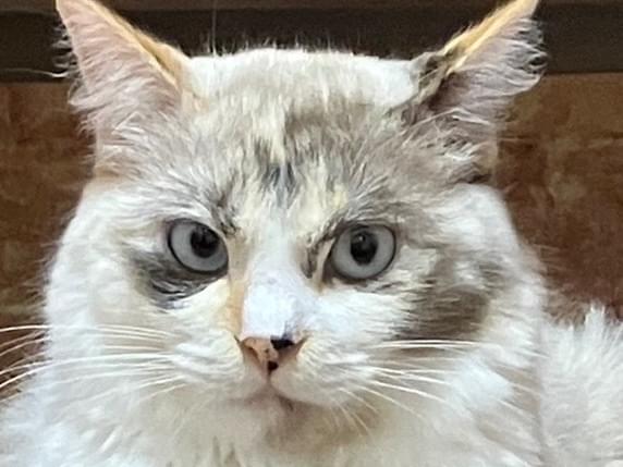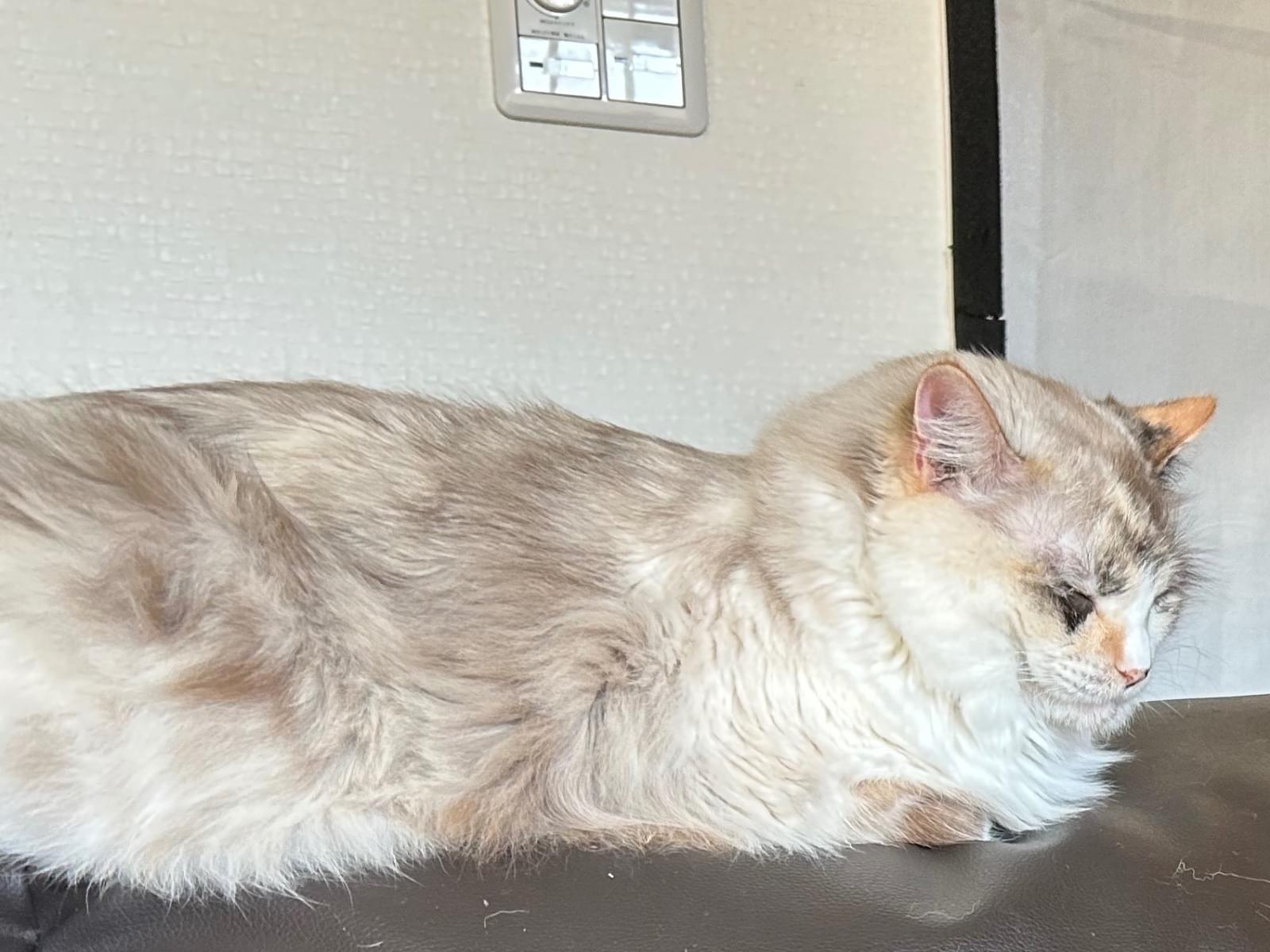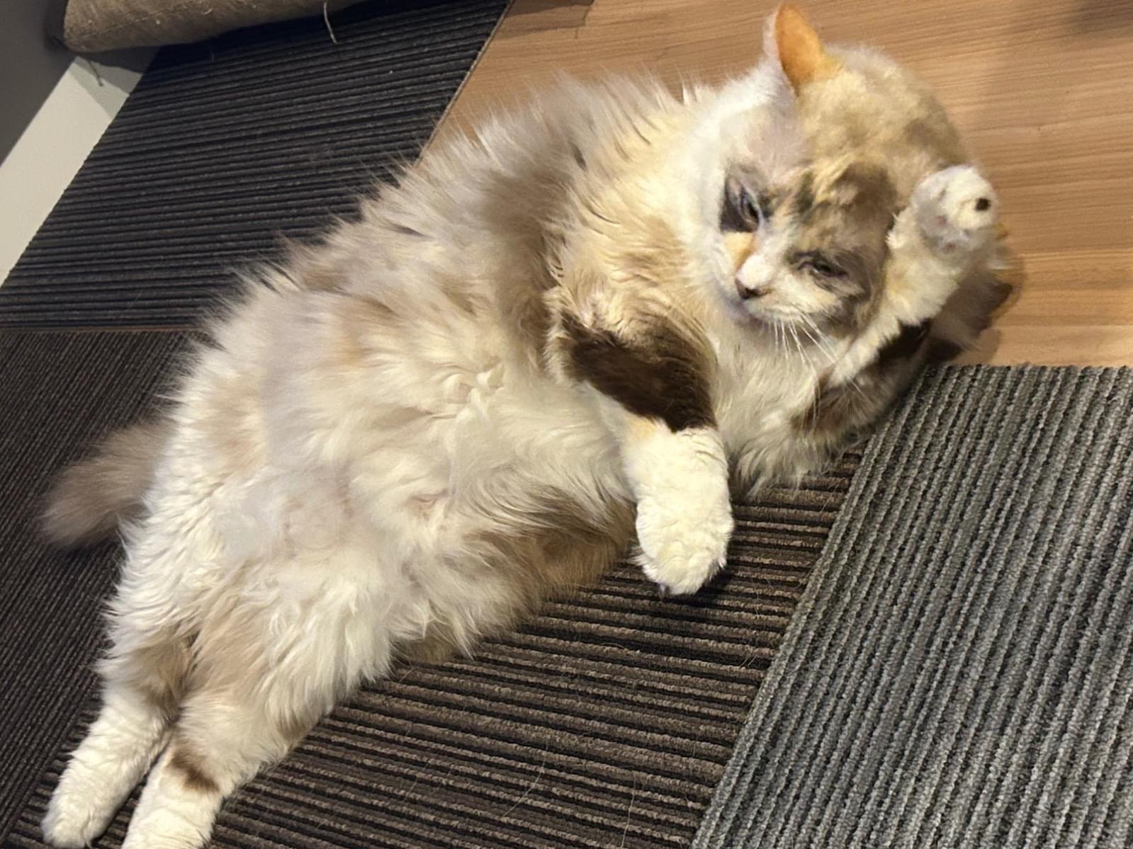 特徴は体重5キロ位で長毛です。毛がふさふさしていて足が短いです。柄は白多めの茶色とグレーが混ざっているMIX猫です。