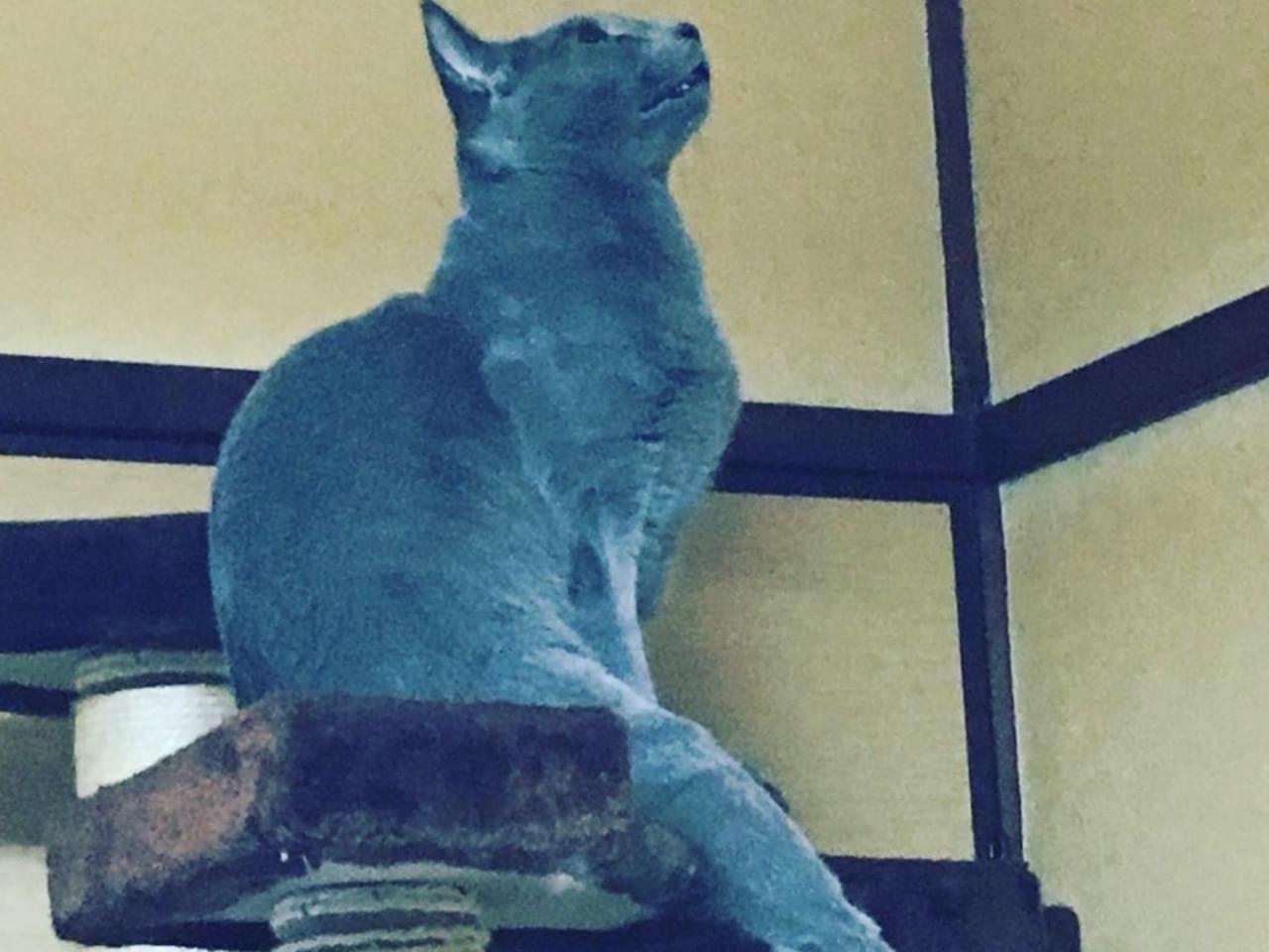 ロシアンブルーなので全身グレーの毛色に緑の瞳。