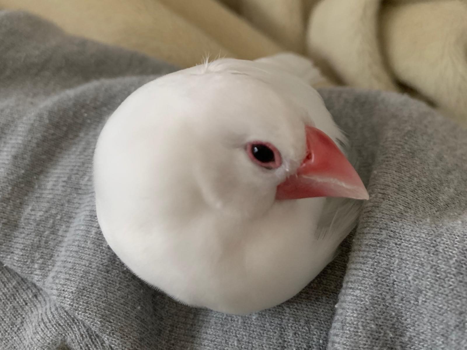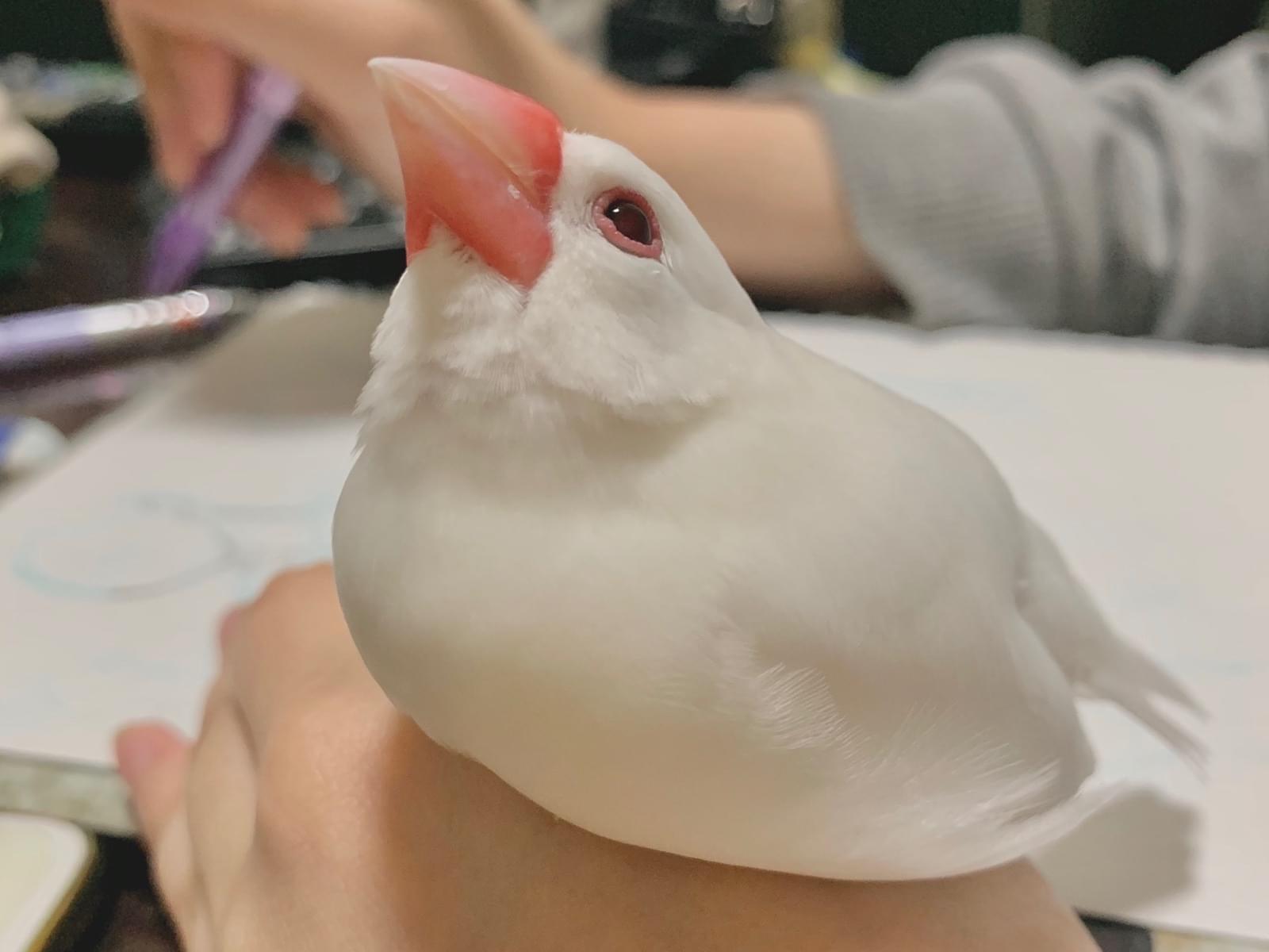 真っ白な毛並みでくちばしに少し傷があるかもしれません。肩や手に乗ります。高い声と長い爪が特徴です。