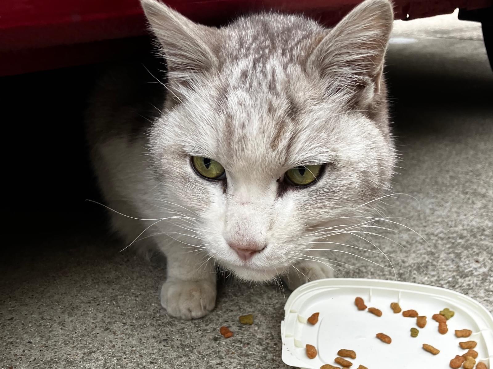 とても人懐っこいねこちゃんで、触っても逃げません。結構大きめのねこちゃんです。お腹付近に怪我をしてます。