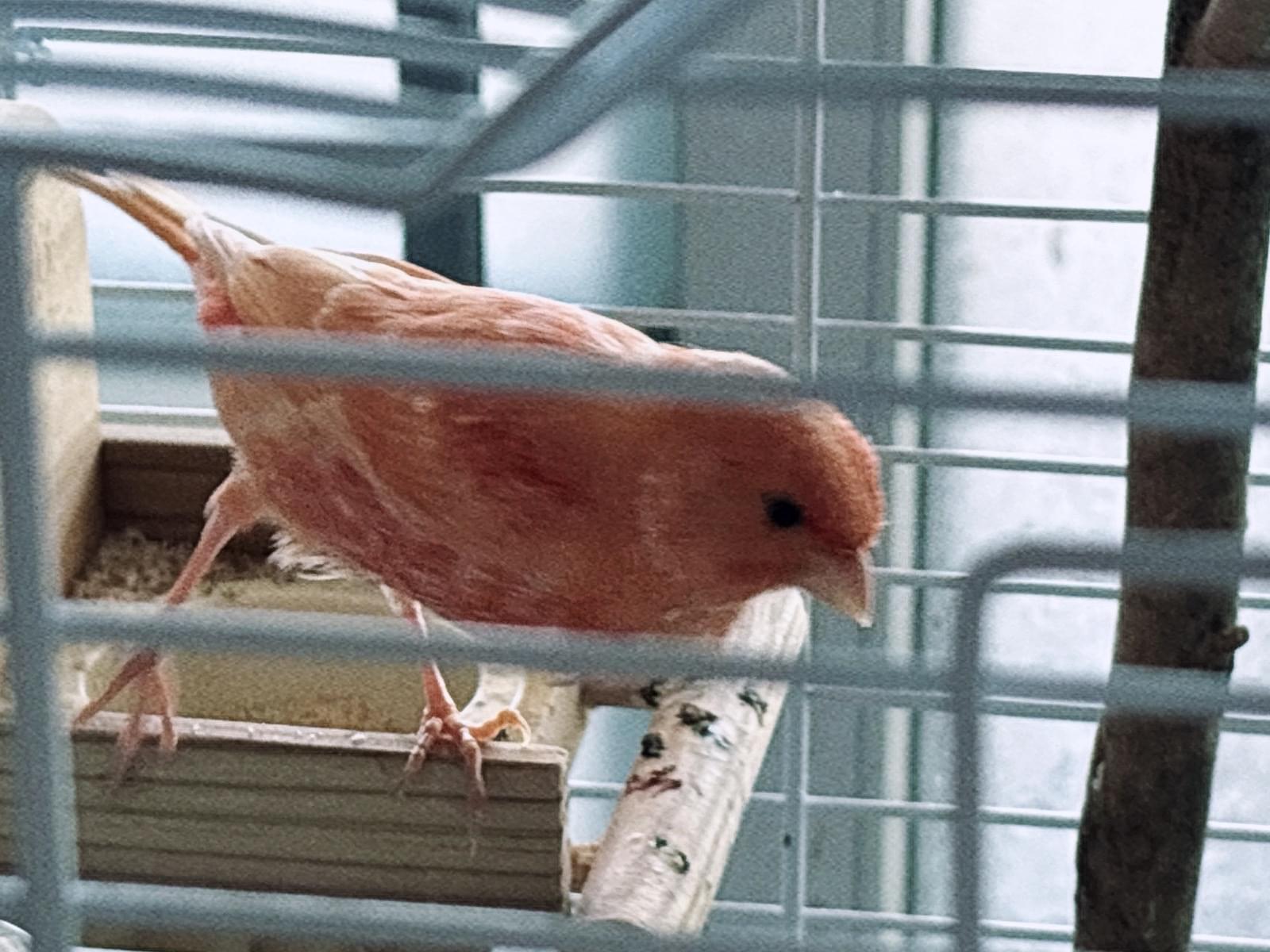 赤カナリアですが淡いオレンジ色です。左脚の指の力が弱く、滑りやすい場所は止まりにくそうにします。メスなのでピーピーとだけ鳴きます。足環は有りません。 ベルちゃんと呼んでいますがあまり自分の名前とは分かってないかもしれません。