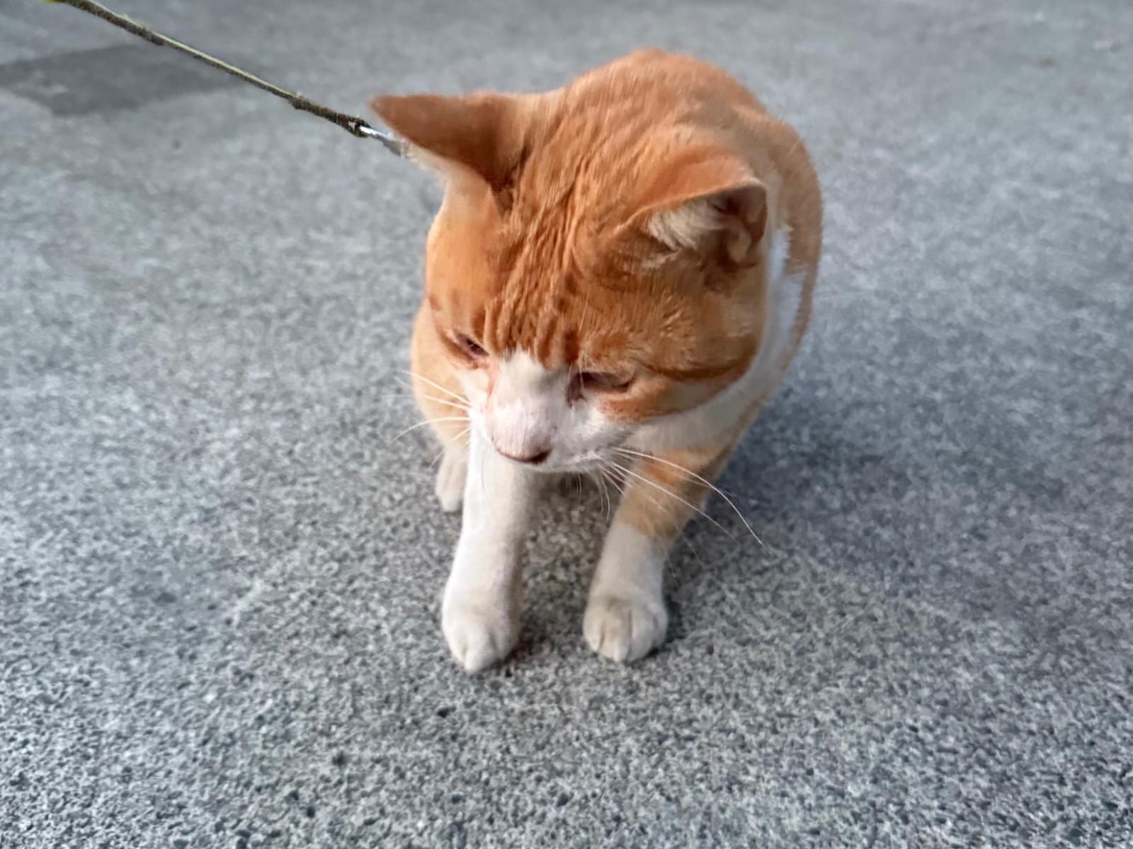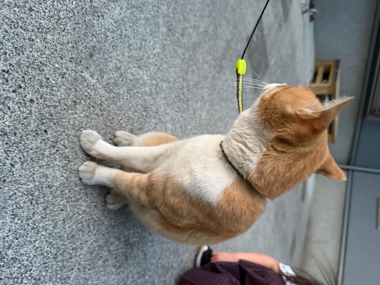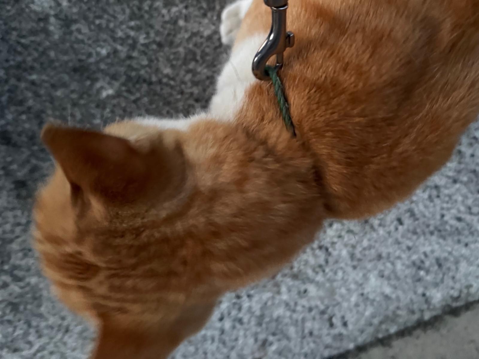茶トラ🐈首輪は緑色で、紐のような細めの首輪。