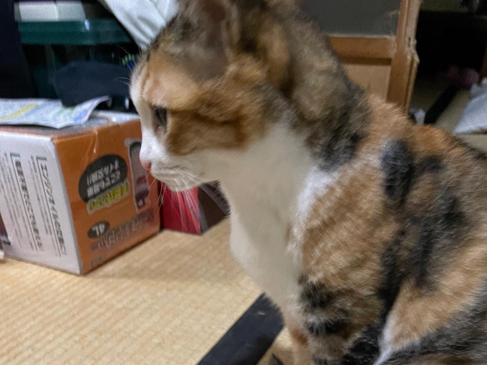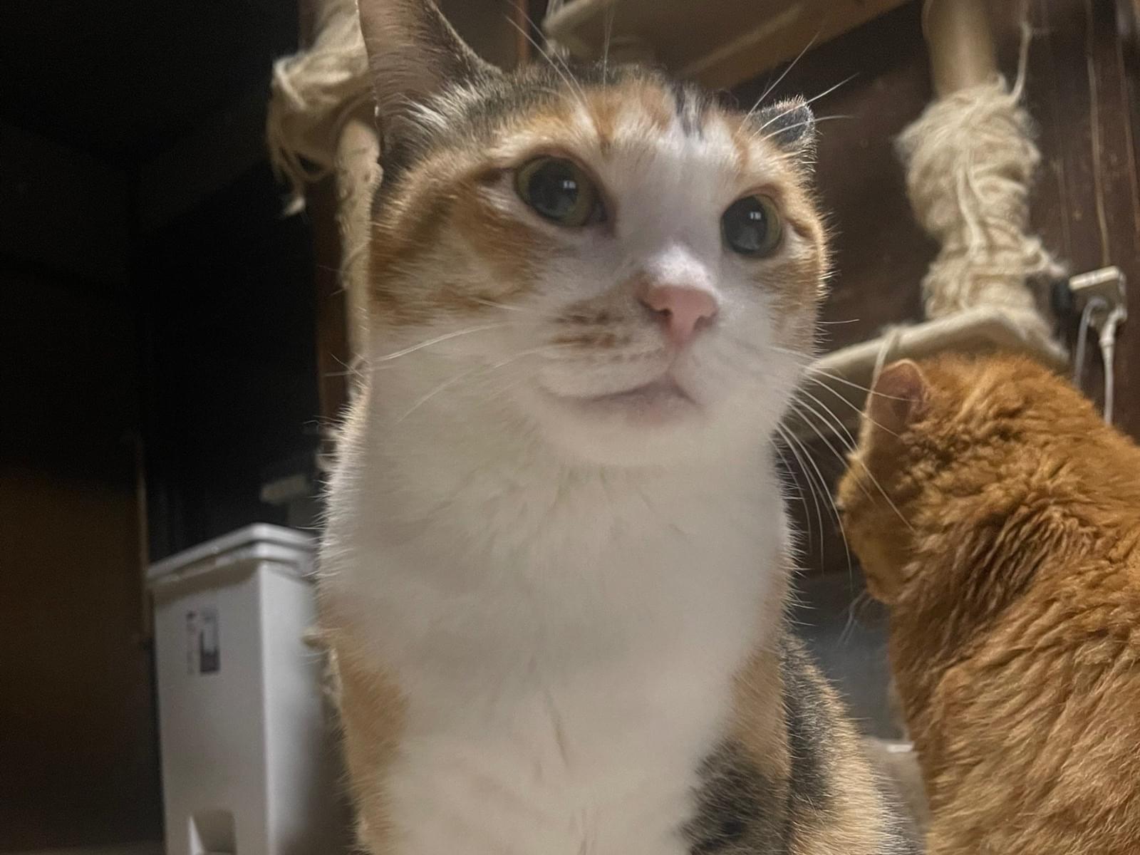 三毛猫でハチワレ模様と口元にクリーム色の模様が片側にある