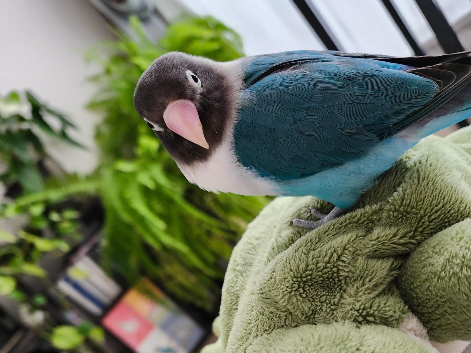 頭は黒、背中はブルー、胸周りは白のブルーボタンインコです。目の下が少し白いまだらになっています。臆病なので大きな声を出すと驚いてしまいます。