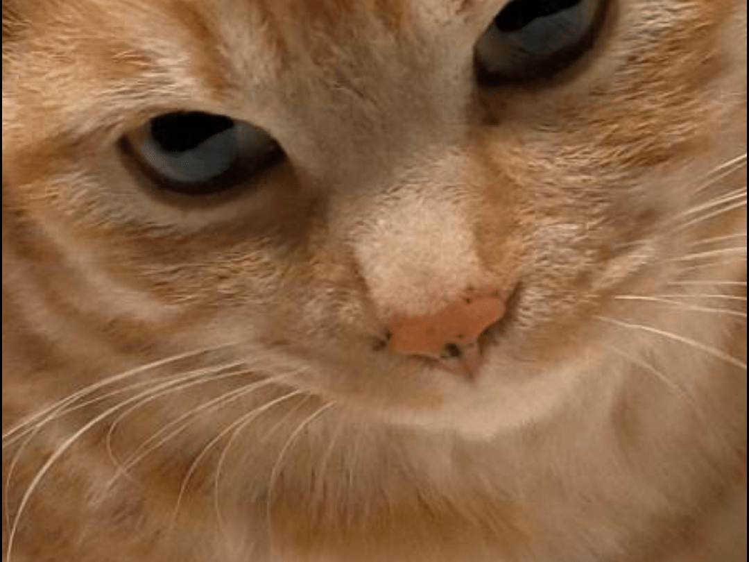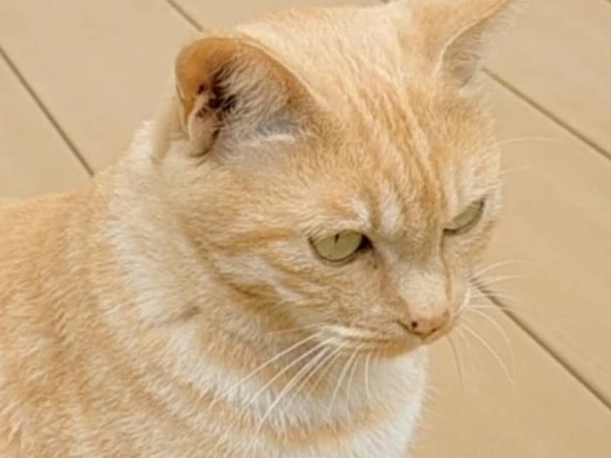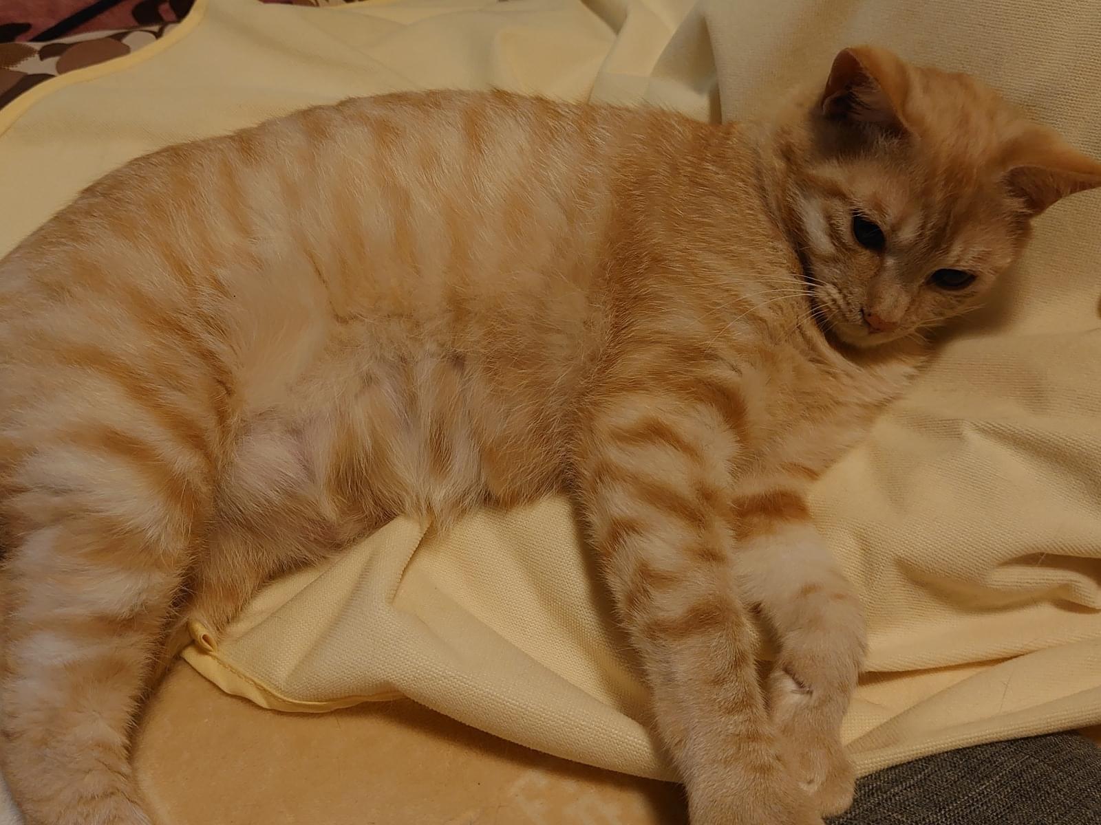 体重4キロ程度。尻尾の付け根が少し曲がっています。ピンクの鼻の所、向かって左側にホクロがあります。