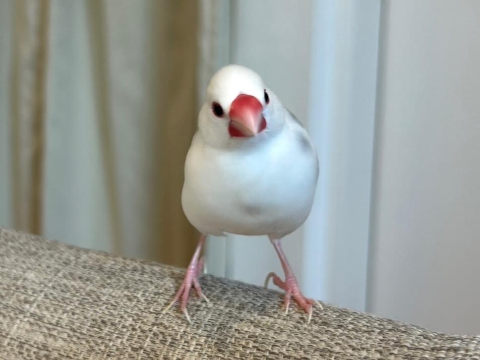 特徴:白に背中、横、お腹あたりにグレーが残っています。人懐こく、肩や指、頭に止まるのが好き。