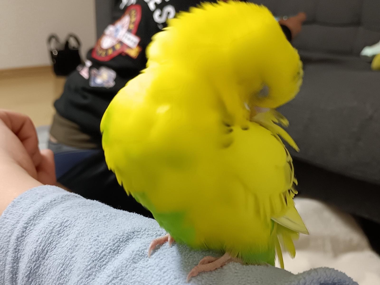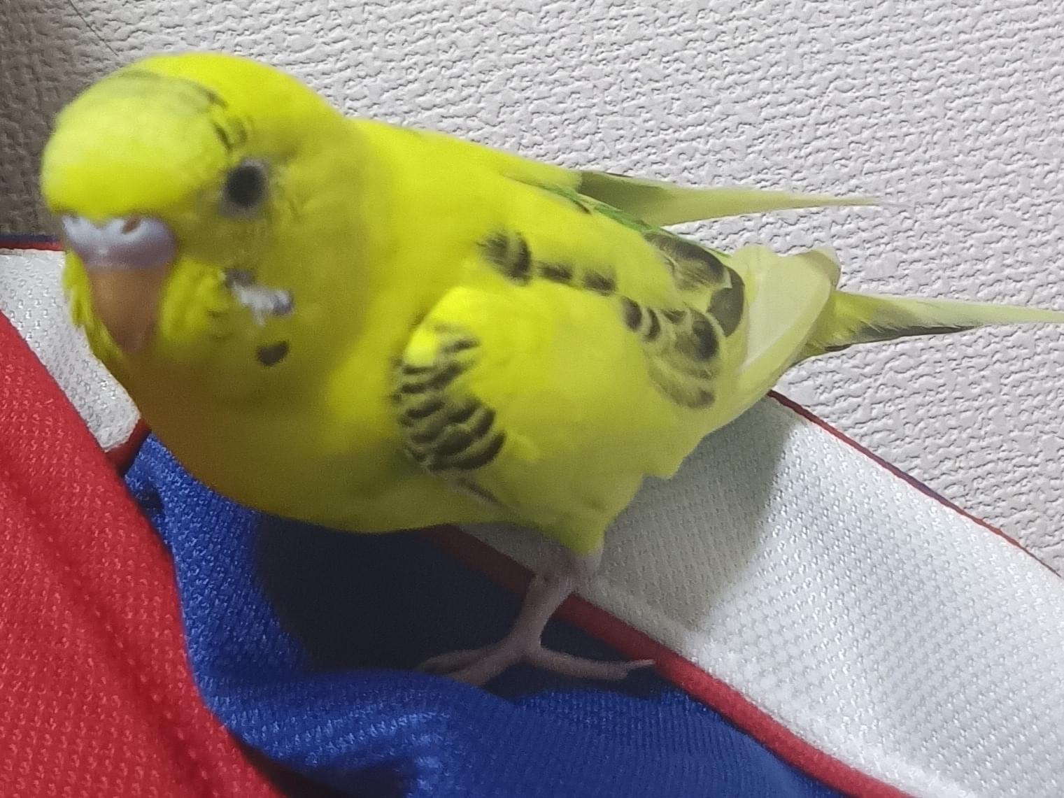 体の色は黄色で、お腹の部分が黄緑です。羽の部分にところどころ黒があります。ほっぺに白い毛と青い毛と黒い毛が生えていていす。とても、ひとなっこいので人の片にとまったりします。言葉は話せないけれど、ゲージにいるときや、部屋を飛んでいる時によく鳴いています。多声ですので、色々な鳴き声をします。コーヒーのはいっているコップに顔を入れてしまったことがあり。顔の一部が茶色くなっています。