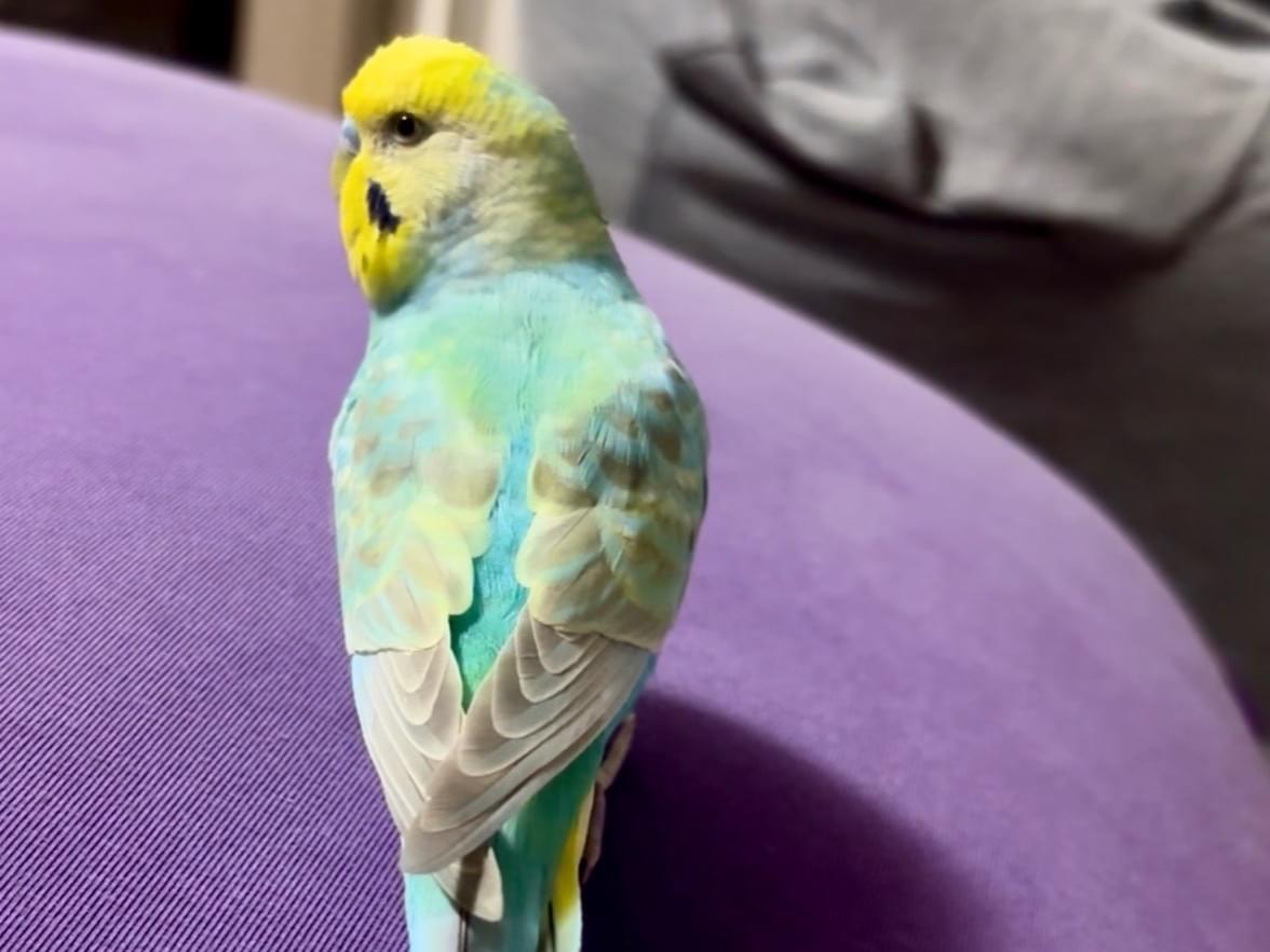体は水色で頭は黄色、鼻は青色のセキセイインコです