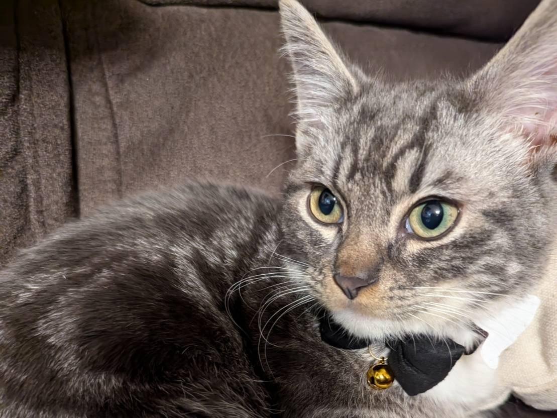 青い鈴の着いたリボンの首輪をしてるマンチカンを探しています。