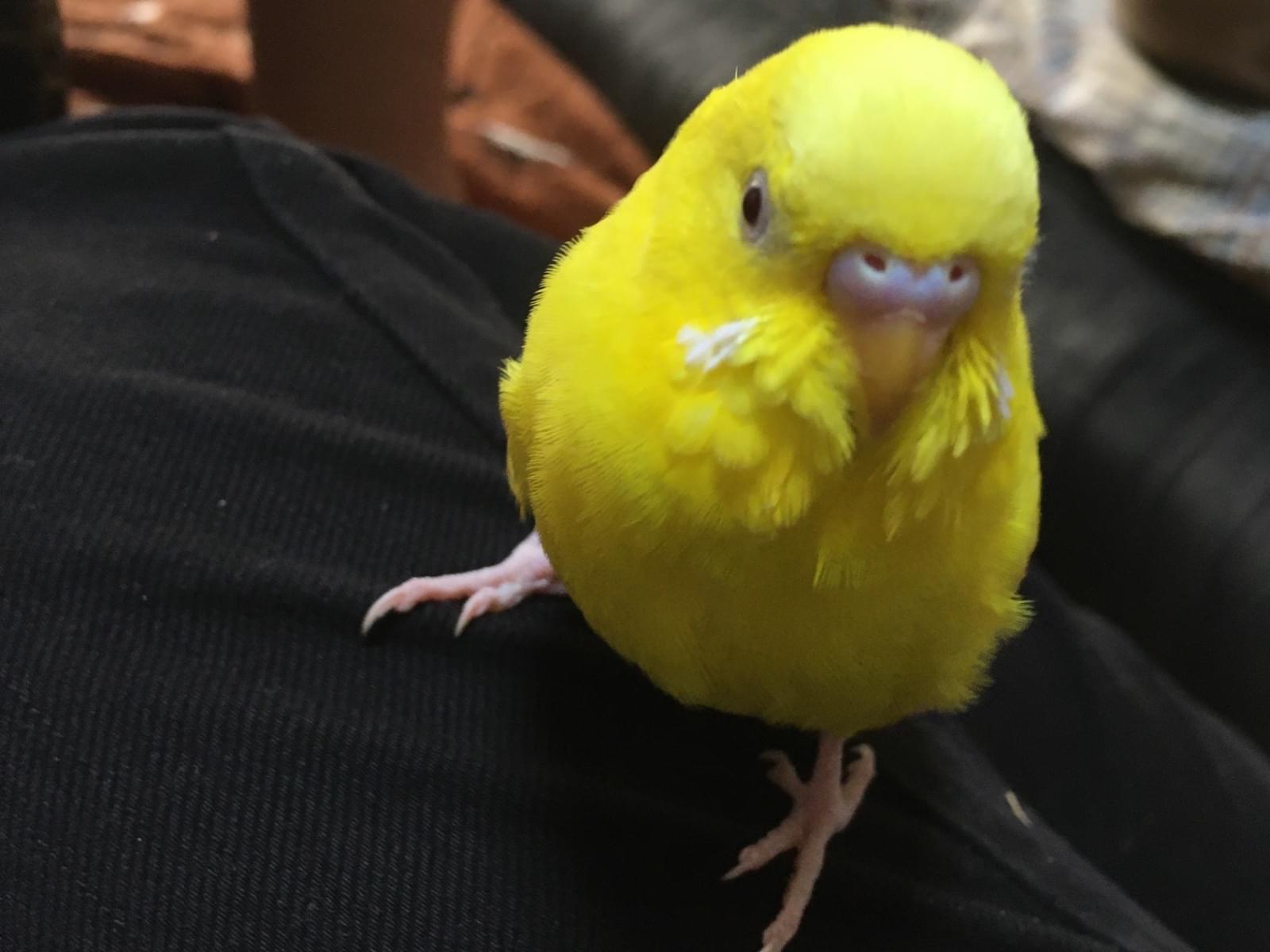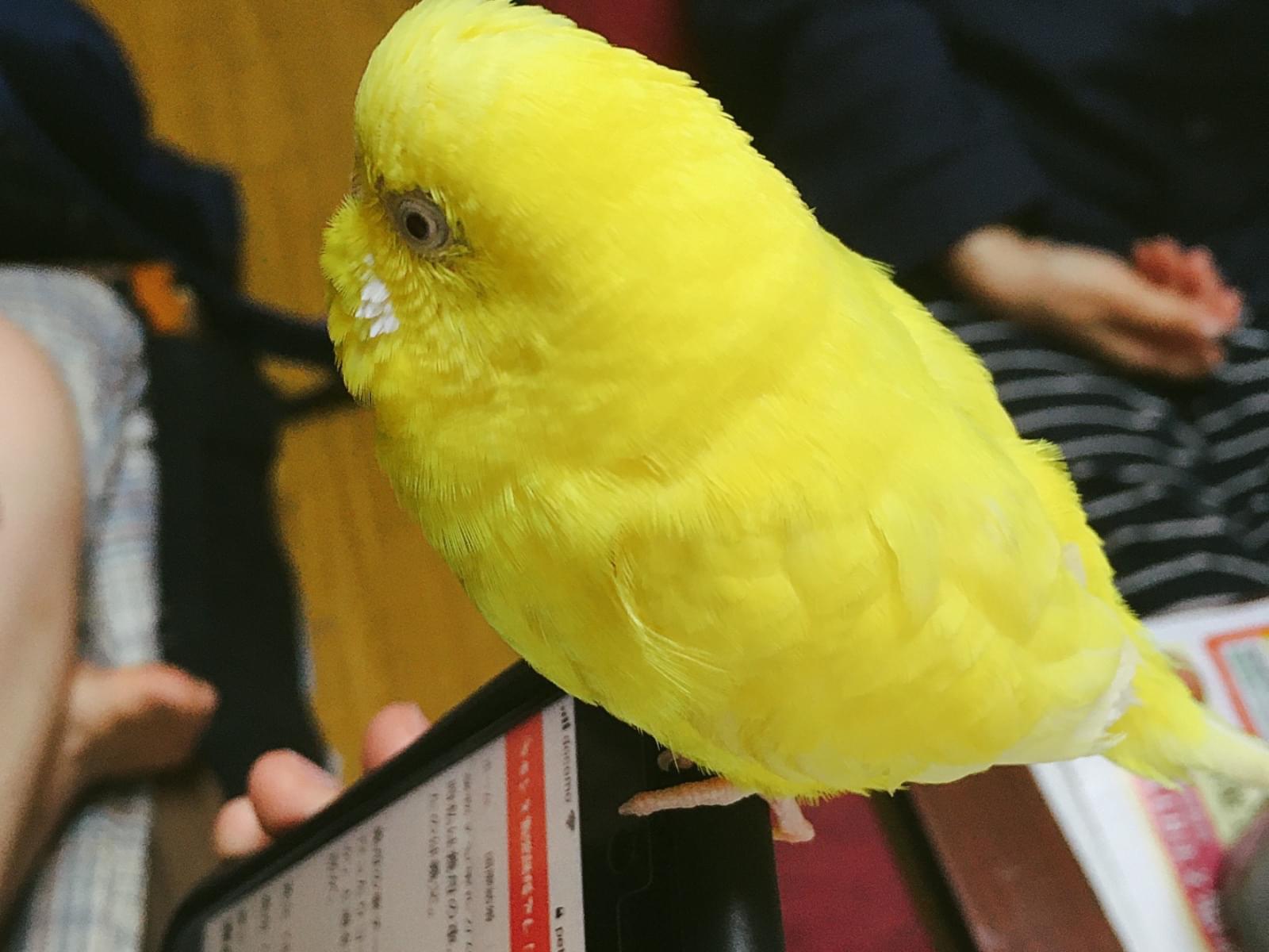 黄色いセキセイインコで尾羽と風切羽の後ろ側が白っぽくなっています。