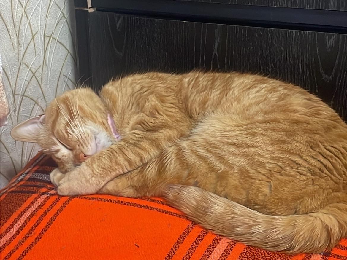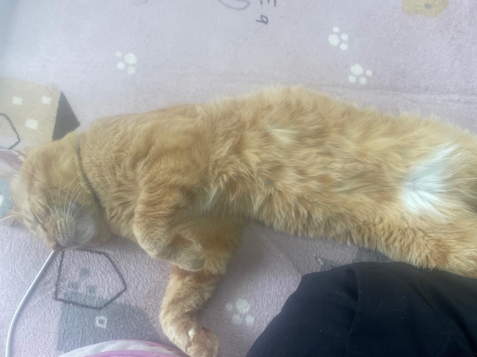ピンクののみよけ首輪をしておりおへそが白く耳が少し大きい茶トラです。パンと呼ぶと鳴きとても人懐っこい