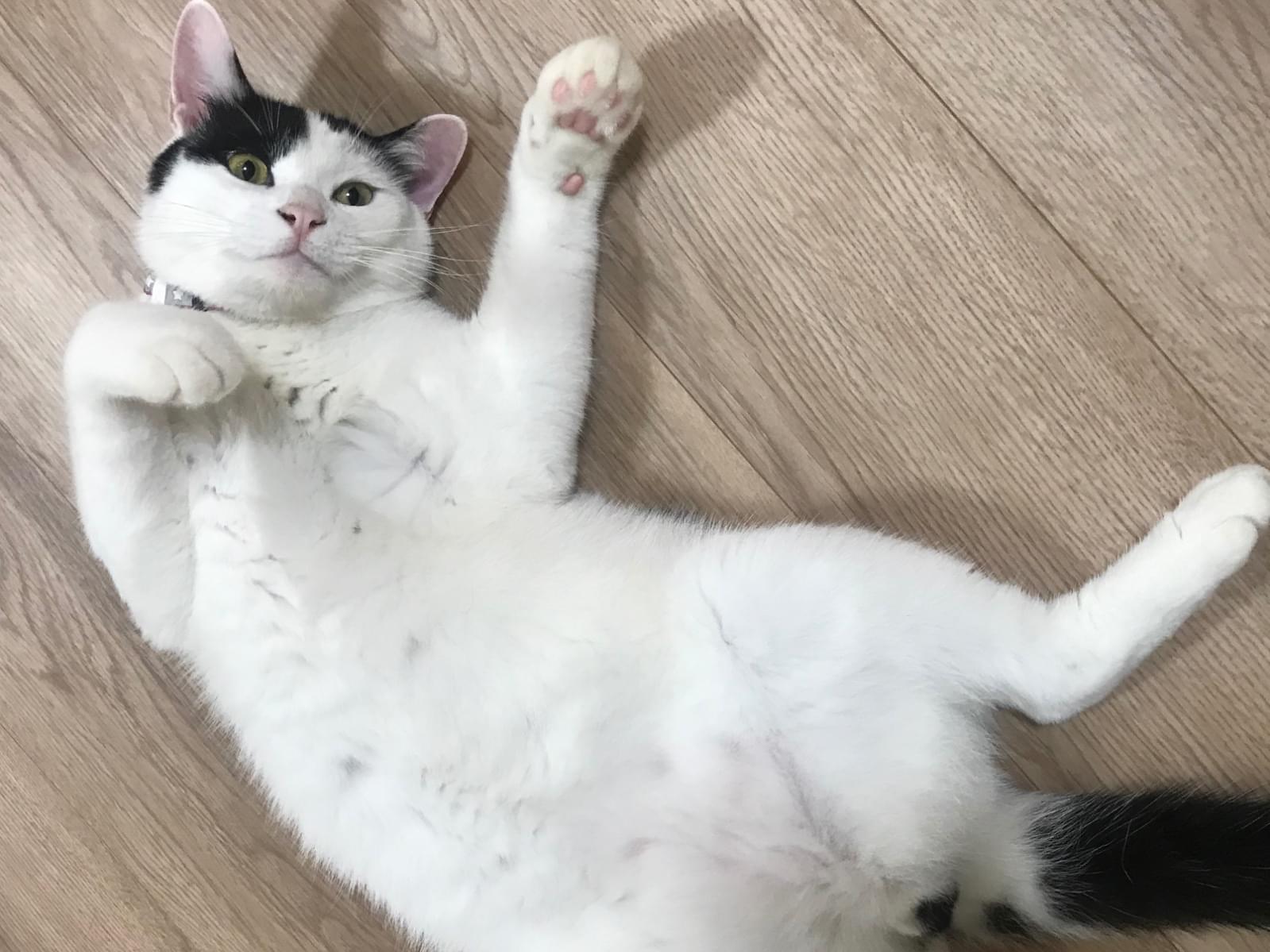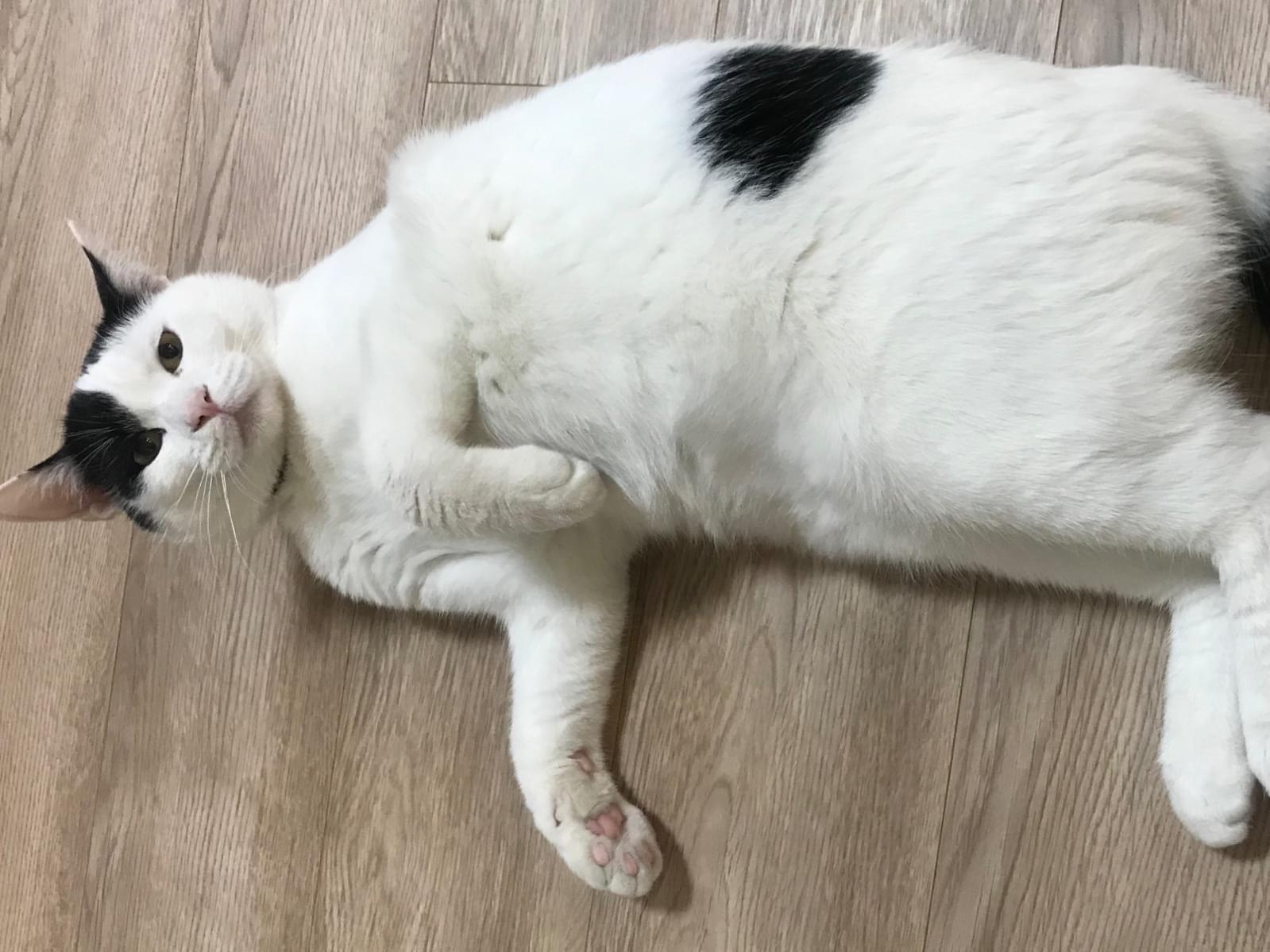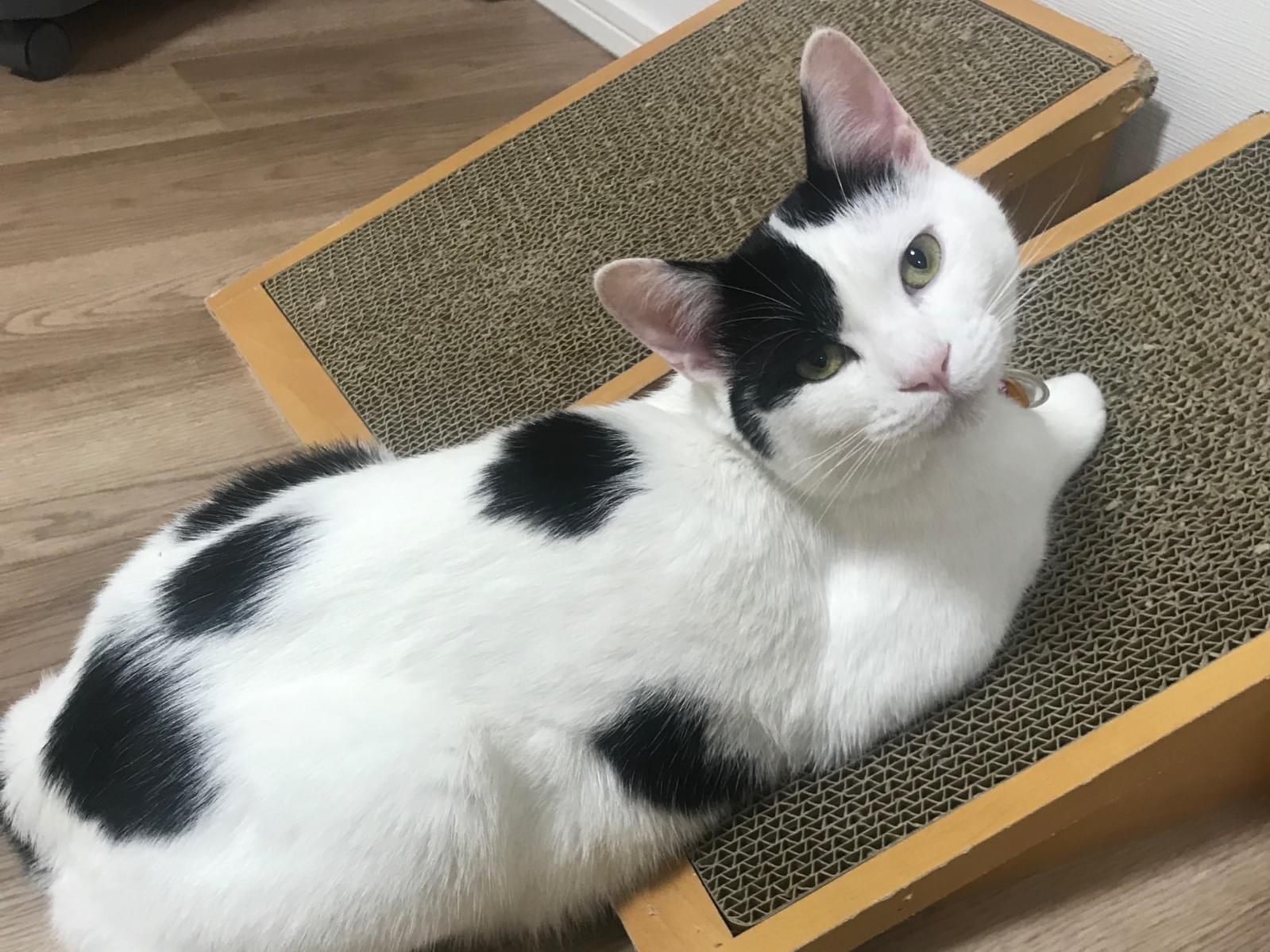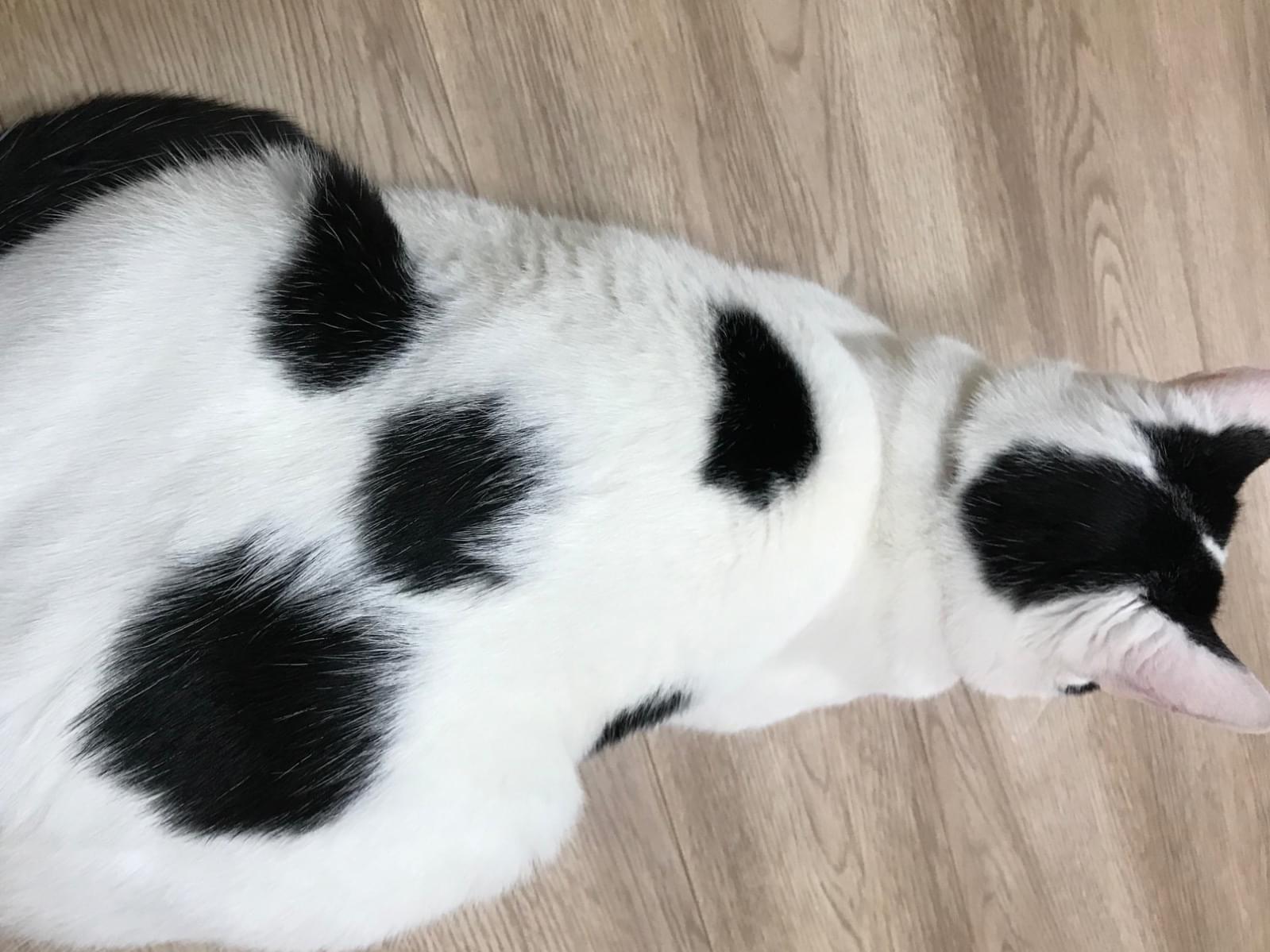 白黒で白の割合が多く、背中に5つほど黒の斑点。
