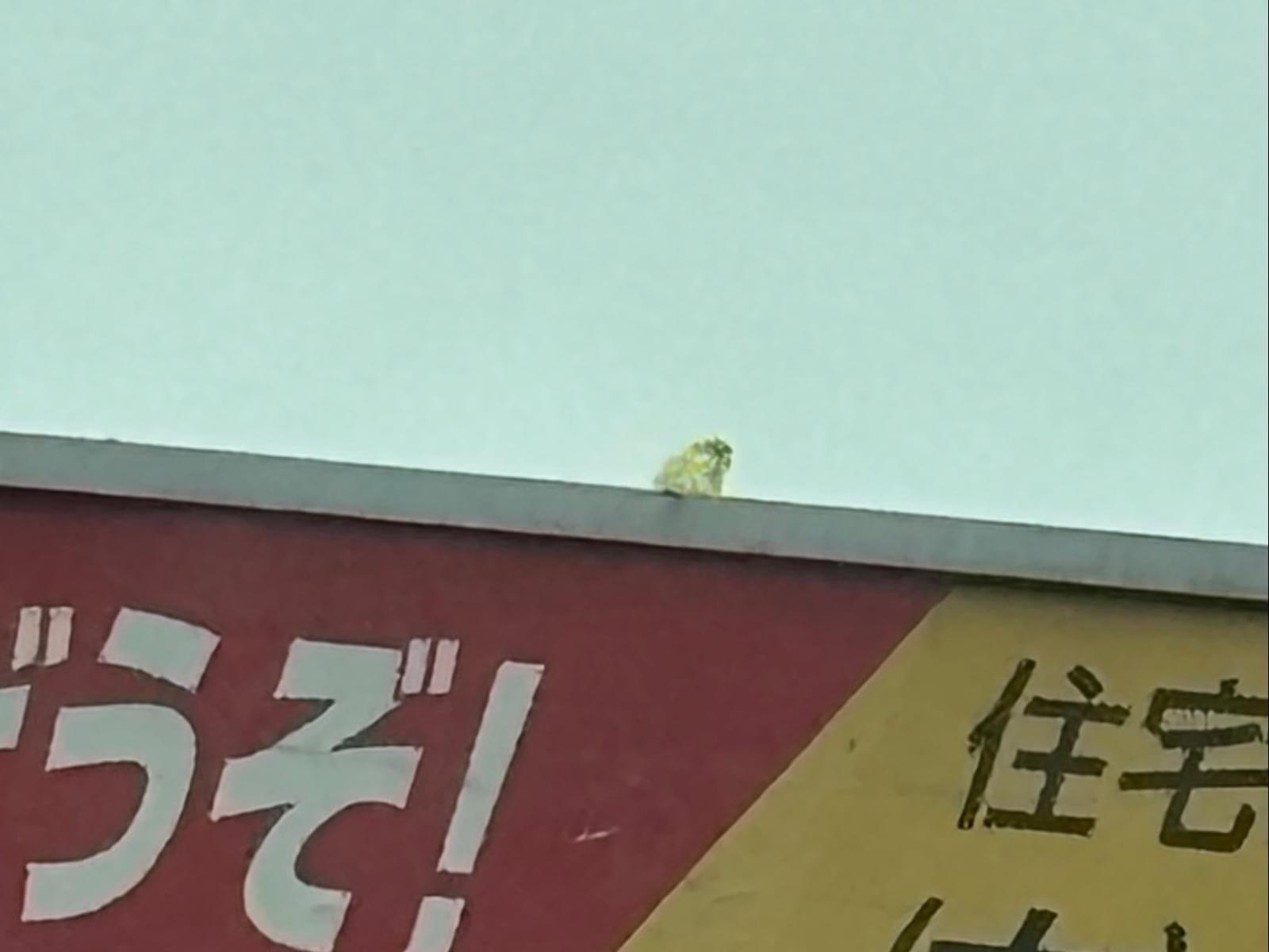 今朝7:30頃に私の耳の横を羽ばたいた音がしたので振り返ったら、黄色のインコがいました。写真を撮ろうと思いましたが、保護する事を優先に考えゆっくり近いたのですが、逃げてしまいました。7:50頃逃げていった方面の少し行った所のビルの上の看板の上に立っていました。