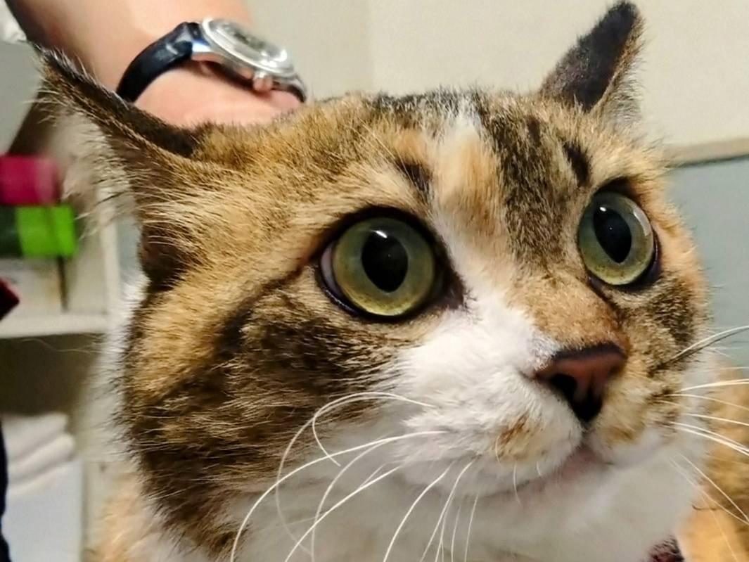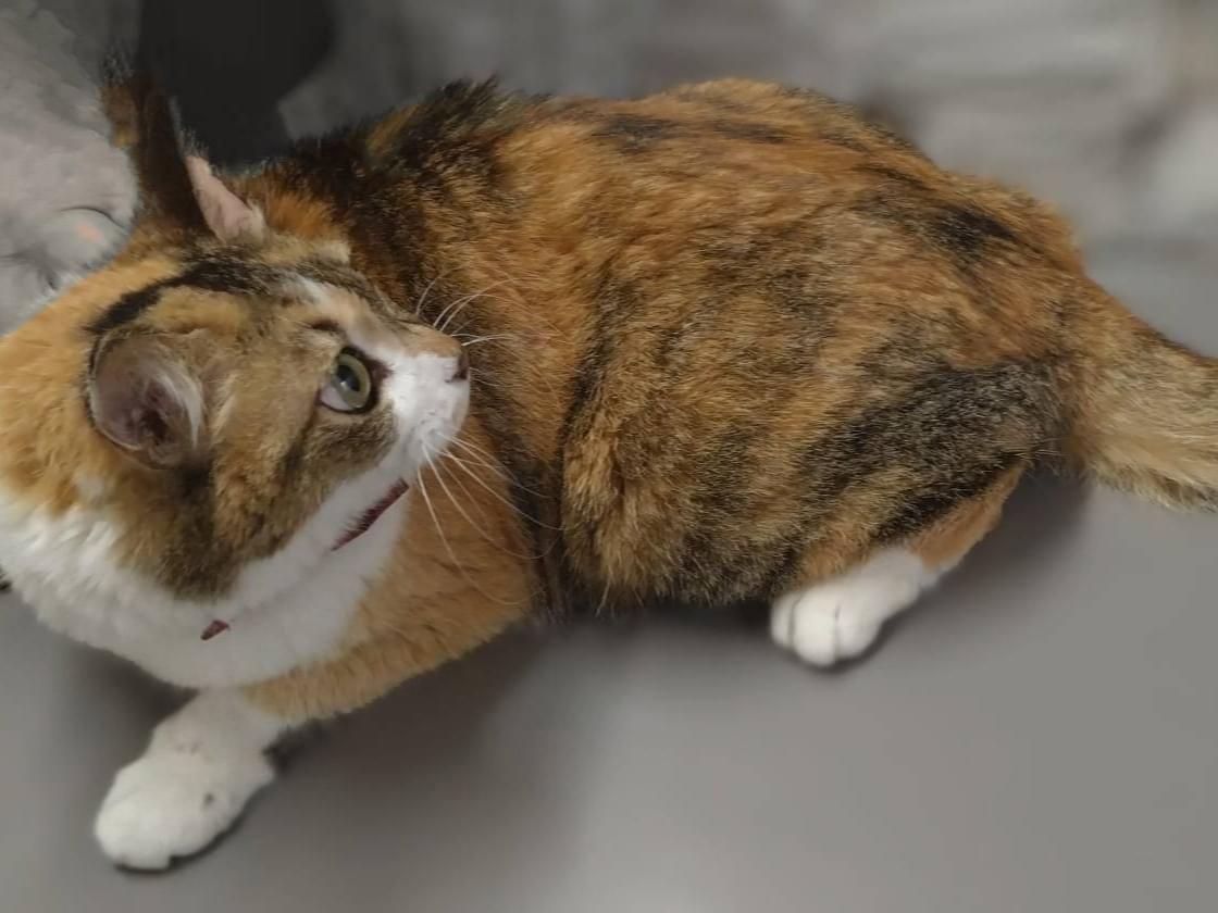 首輪をした人慣れ三毛猫を保護しています