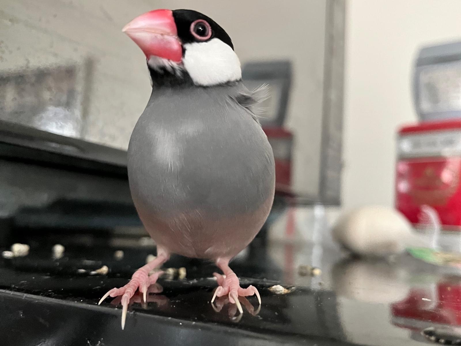 桜文鳥です。色は白黒。玄関を開けたとたん逃げました。その時は夜中で隣の家の屋根に飛んで逃げました