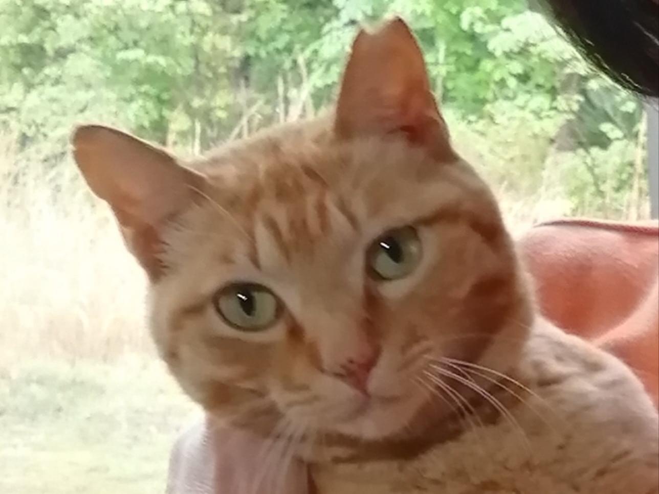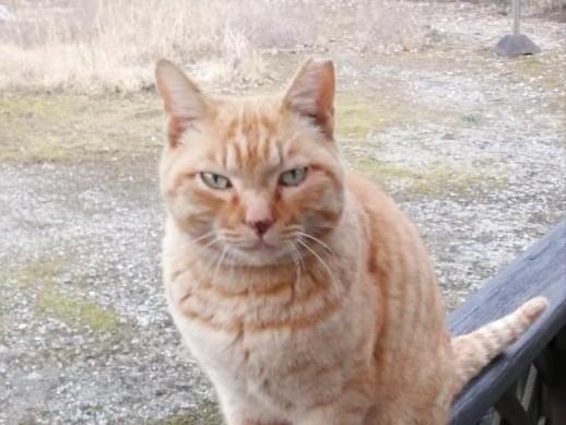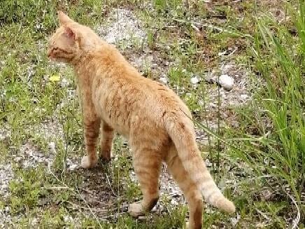 やや大きめの茶トラ猫です。まっすぐな尾長、首輪なしです。
