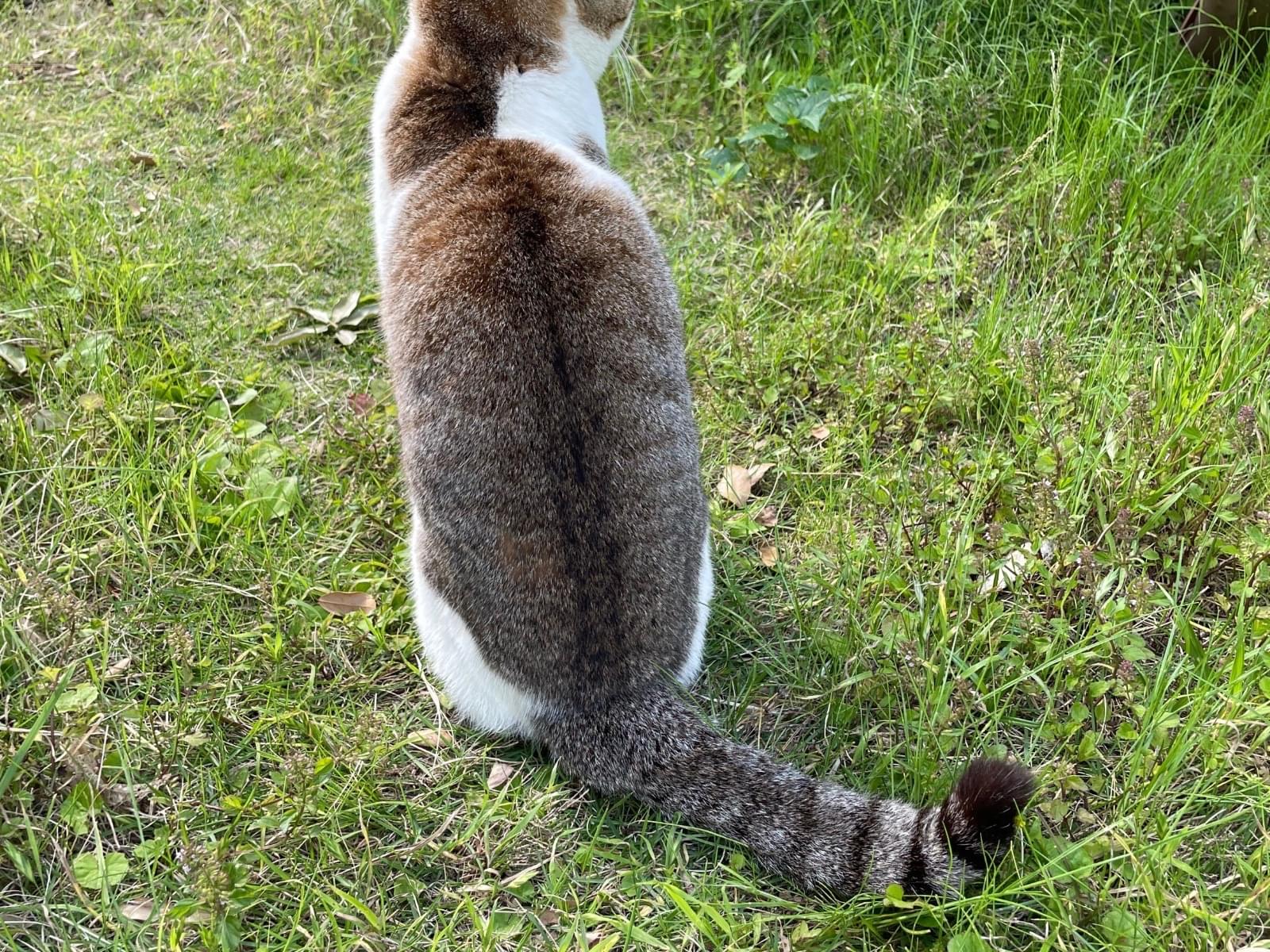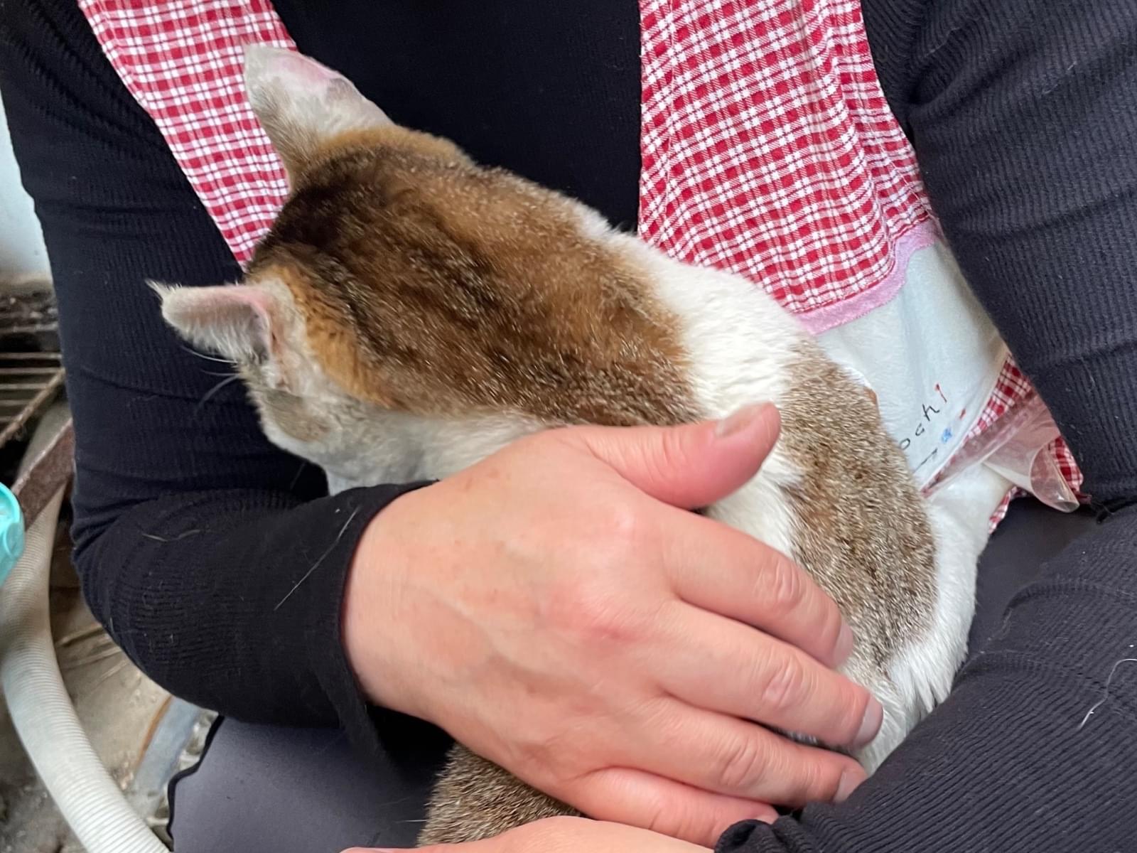 去勢済み、耳カット無しなので飼い猫の可能性があります。とても人懐っこく膝上が好きですが抱っこは苦手です。ひゃーんとよく鳴きます。