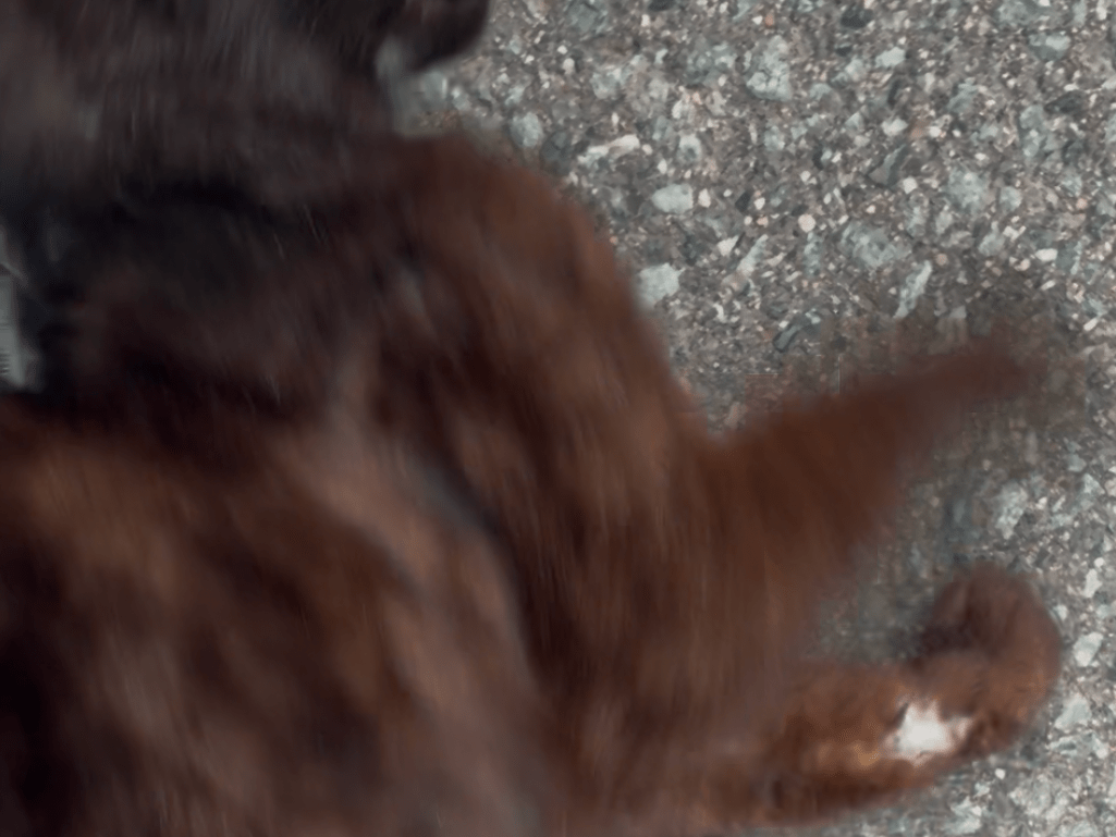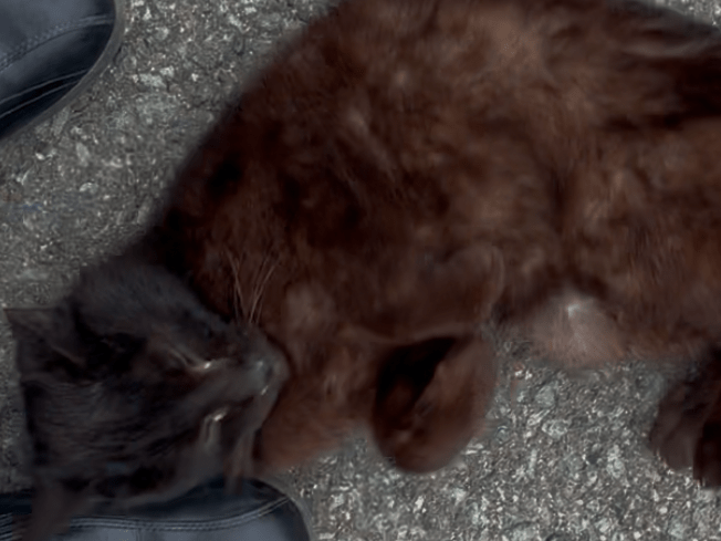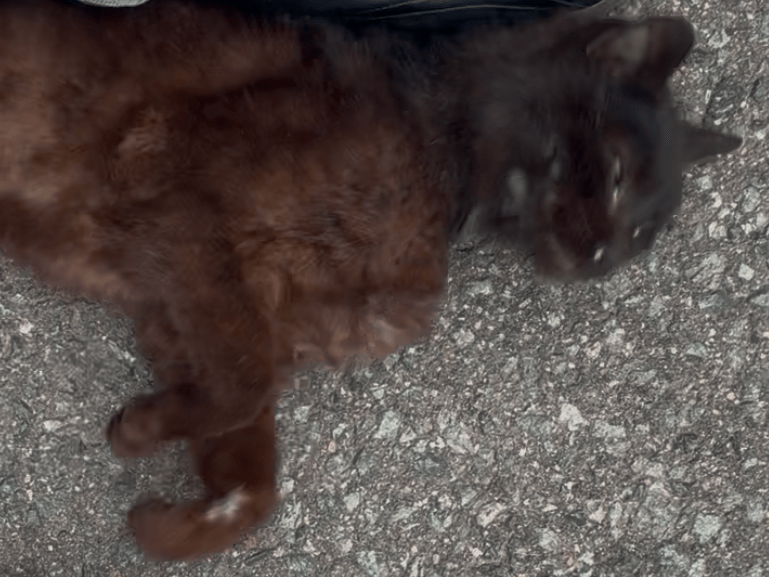 黒猫ですが痩せていて地肌が見えている部分も多く、特に左の前足は毛が無くなって真っ白で、他の部分も栄養不良なのかほとんど茶色でした。白い目やに、鼻水、くしゃみ等もありました。喉もゴロゴロ言っていて、たぶん何かしら感染症でしたが、甘えるように転がったりと元気ではありました。向こうから近付いて来て懐いているようだったので、保護しようと思いました。