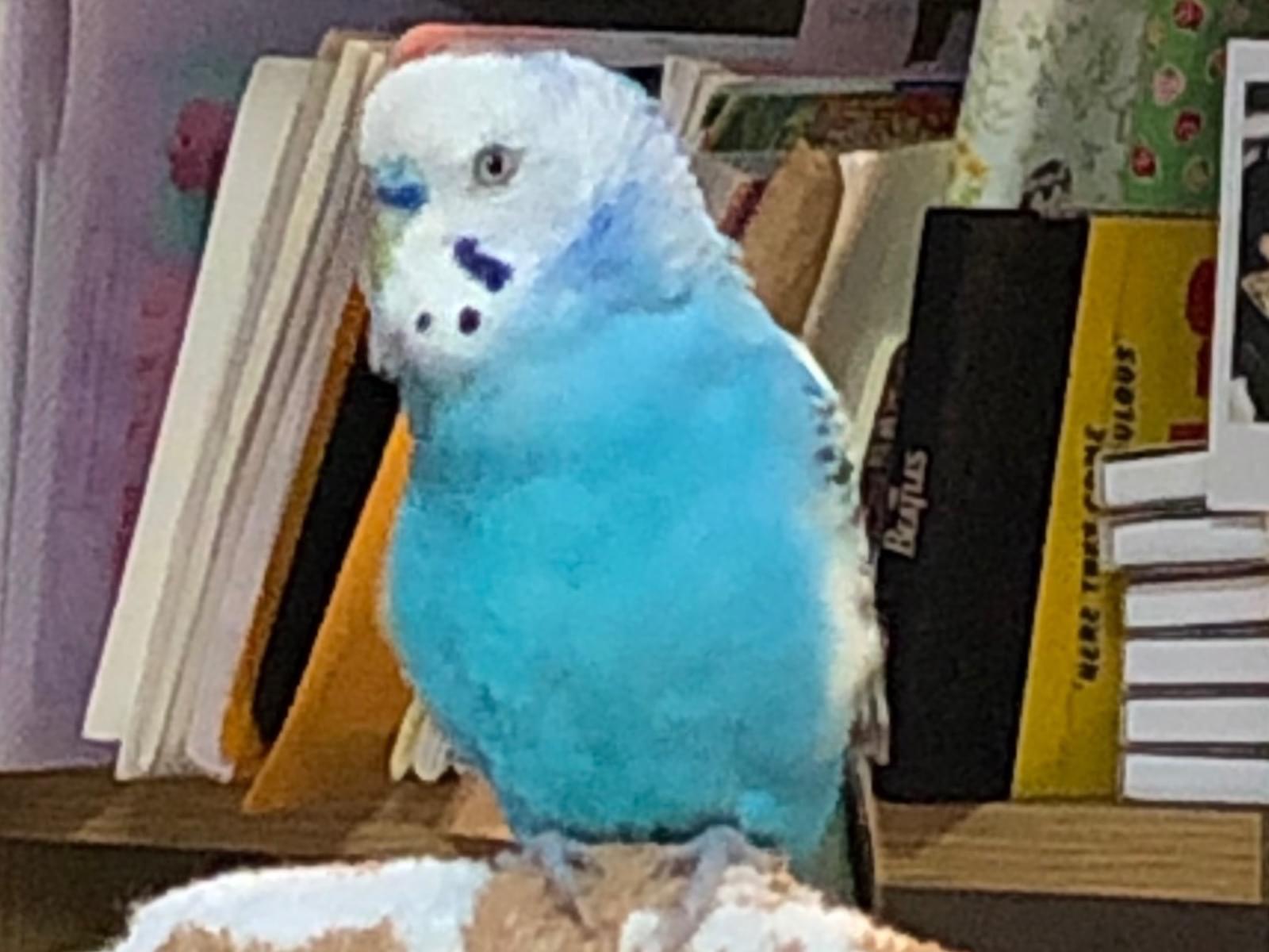 鮮やかな水色のセキセイインコです。頭は白、鼻は青、尾羽は黒、首に青い模様と黒い点4つあります。人に慣れていて知らない人の肩にも自分から乗ってくることがあります。