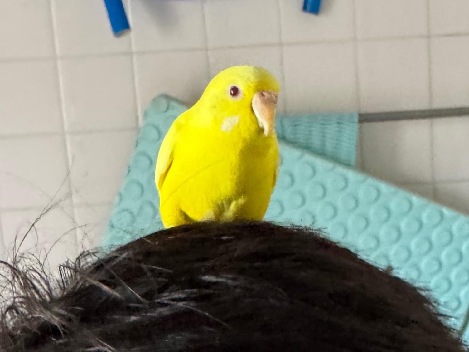 手を差し伸べたらすぐに乗って来て、ゲージが到着するまで1時間以上、私の頭や肩に乗ったままで、かなり人懐こい性格のようです。