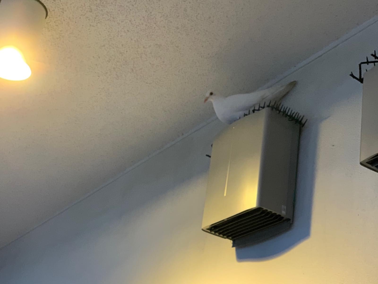我が家には5月8日から時々フンが沢山あり、対策をとりました。昨日、夕方6時頃、実際に鳩を目撃しました。小さめの綺麗な白い鳩だったので、飼われていた子なのではないかと思いました。