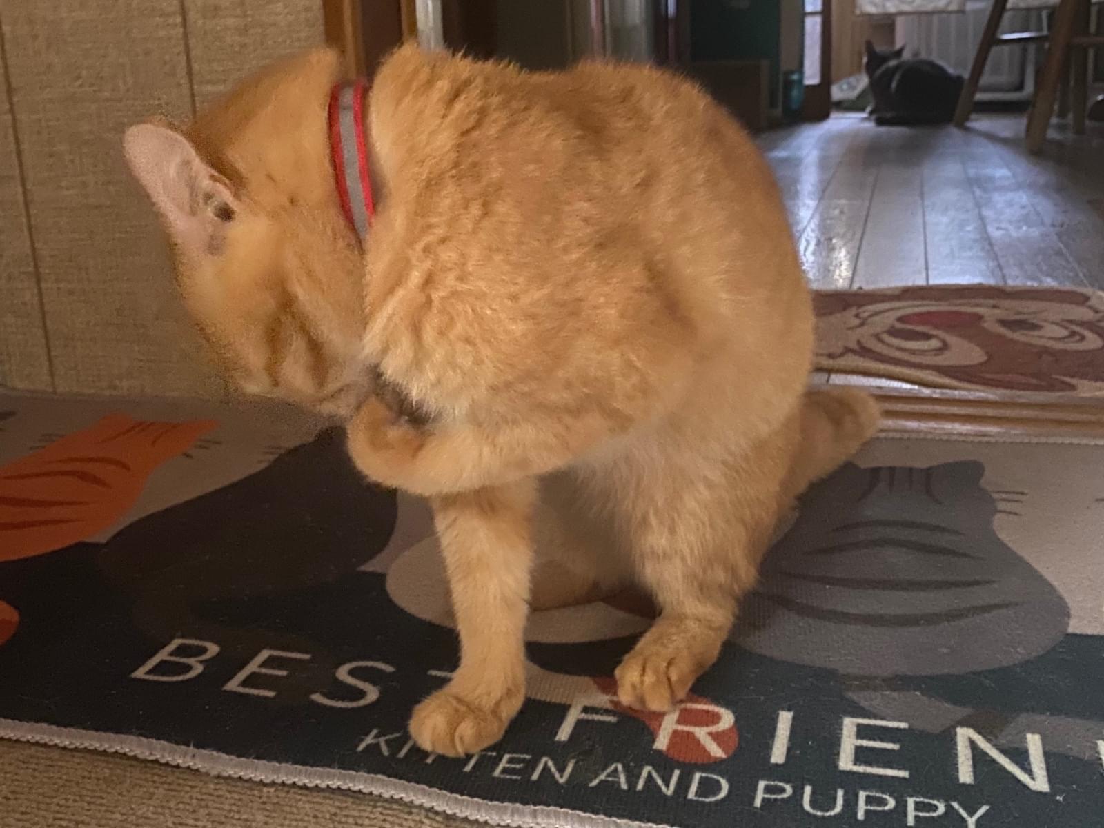 首輪は外側がデニム素材で内側が赤い首輪をしています。5枚目、六枚目の写真の首輪です。もしかしたら引っかかったら外れる猫用首輪なので首輪が無いかもしれないです。
