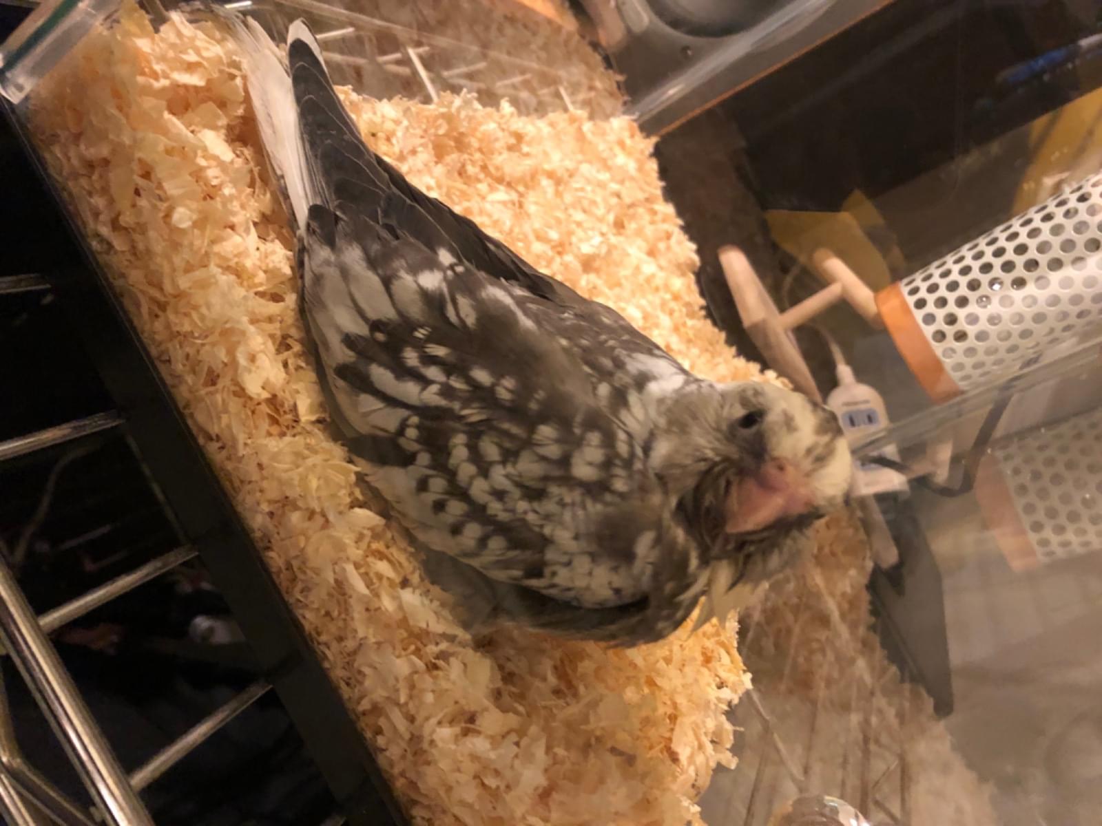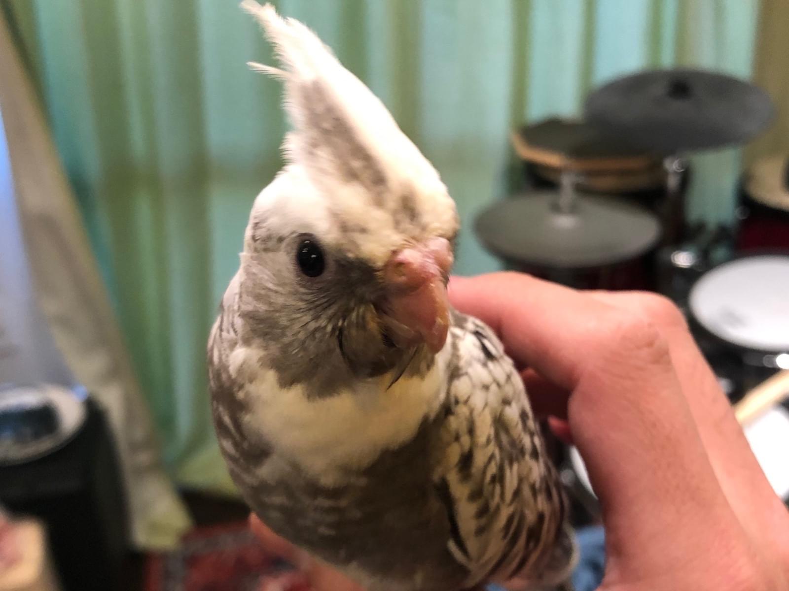 白と灰色が混ざった体色をしています。放鳥中に玄関を開けてしまい、飛んでいってしまいました。