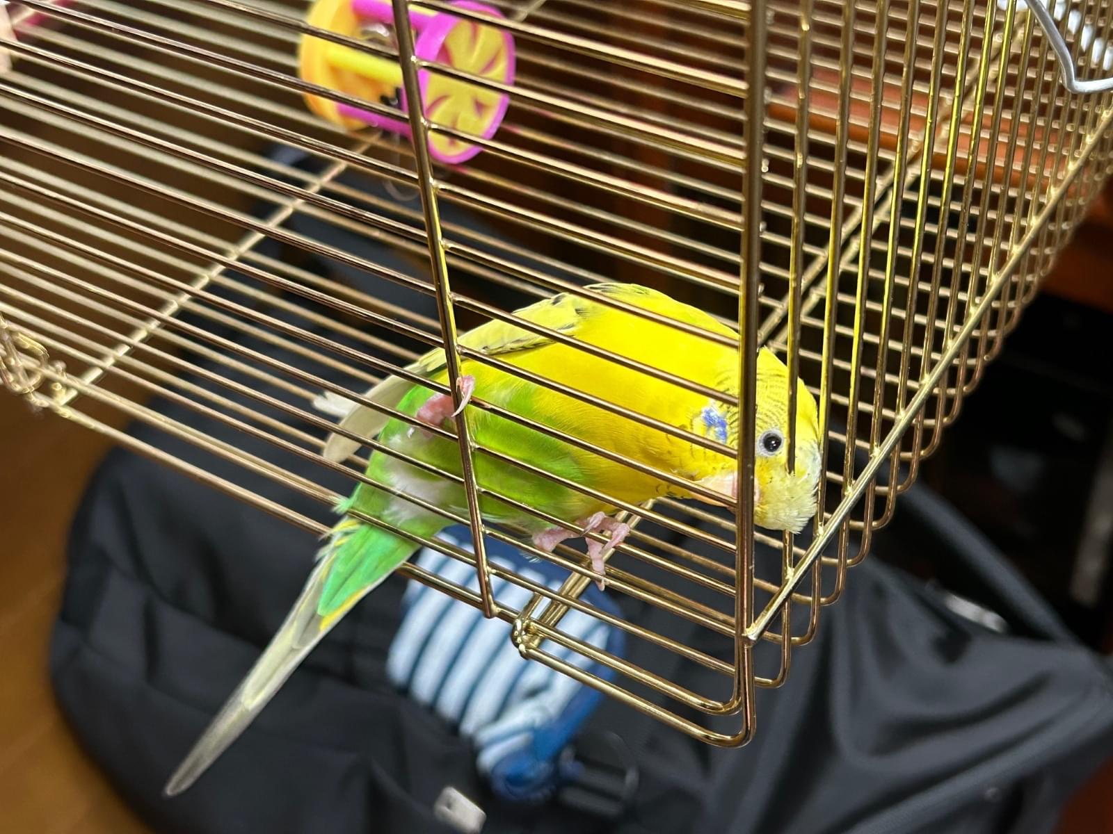 ハルクインの黄色のインコちゃんです。鳴き声はThe鳴き声と言うよりかは「ぴー!」とはっきり言っている様に泣きます。