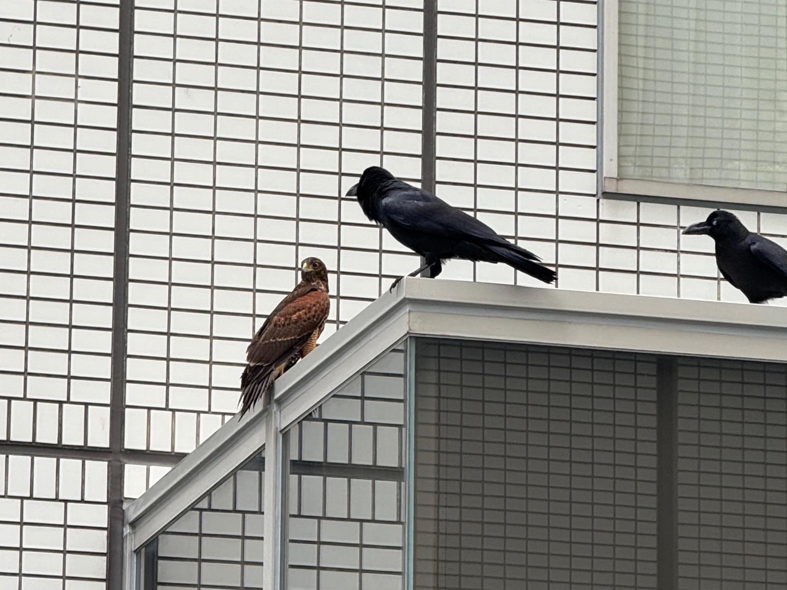 写真には収められなかったのですが、この子が飛んだ際、足に、黒い紐かベルトのようなものが付いているのが見えました。おそらく人に飼われている猛禽類(タカ?)かと思います。羽は茶色です。