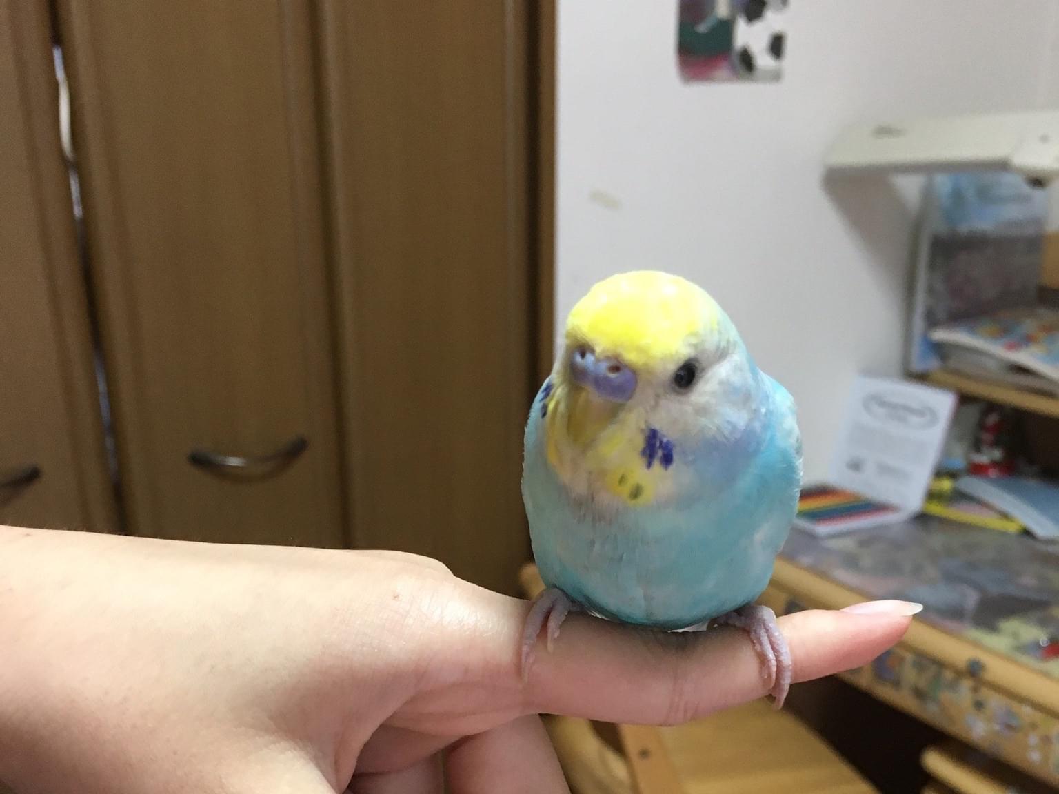 セキセイインコのレインボーです。顔は黄色体はグリーンがかった水色です。怖がりな性格ですが一応手乗りインコです。