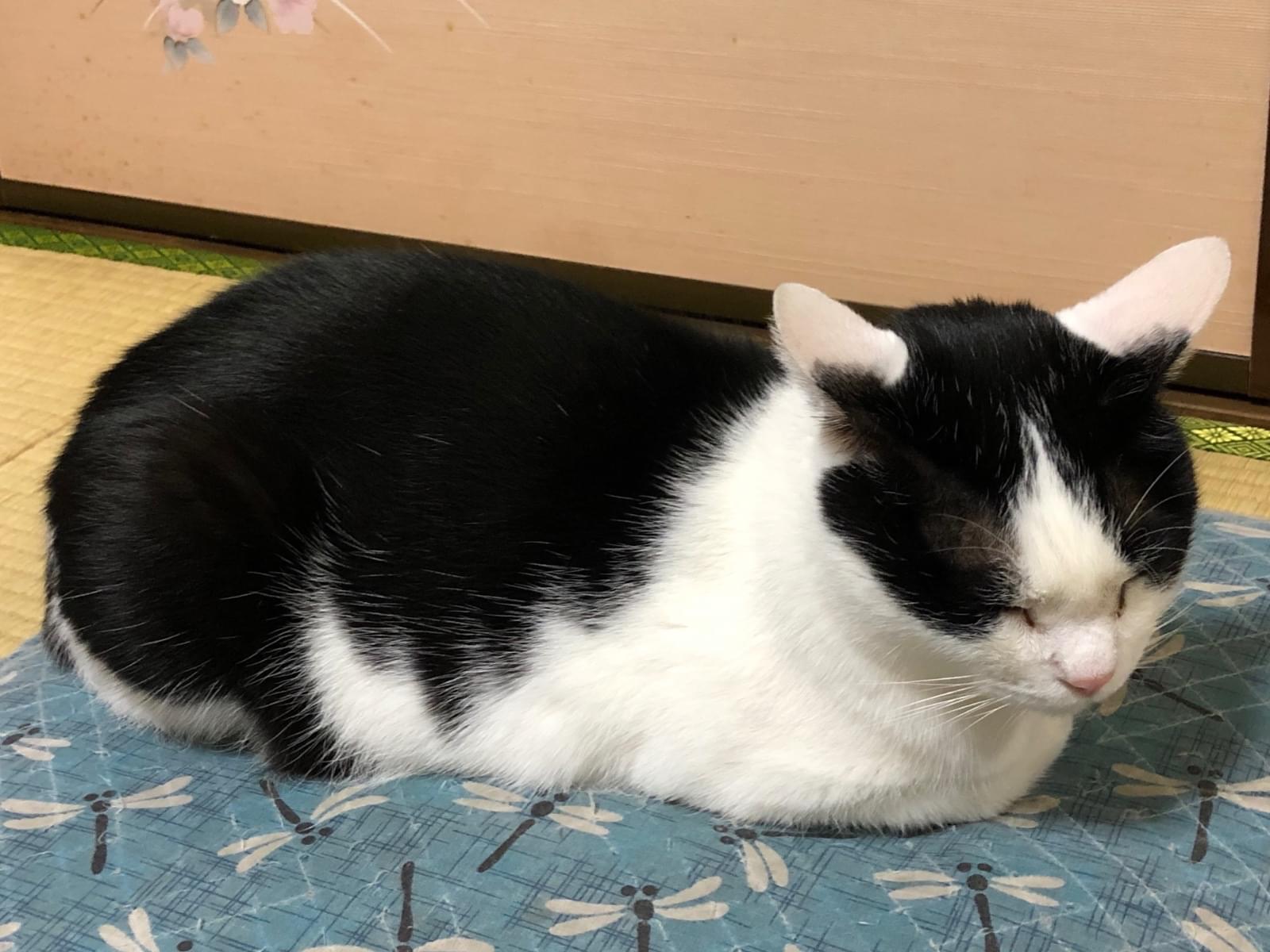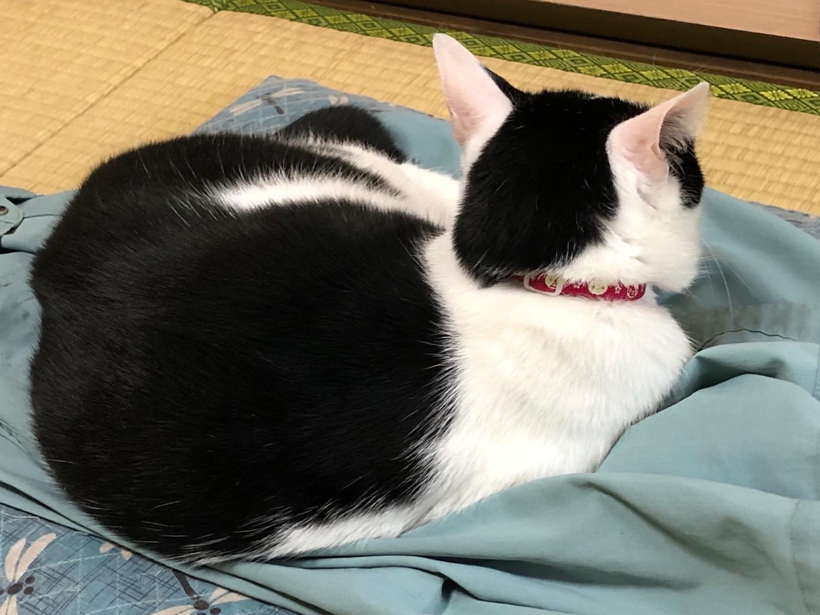 白黒で境目が目のところにある富士額で、尻尾は長めのカギ尻尾です。