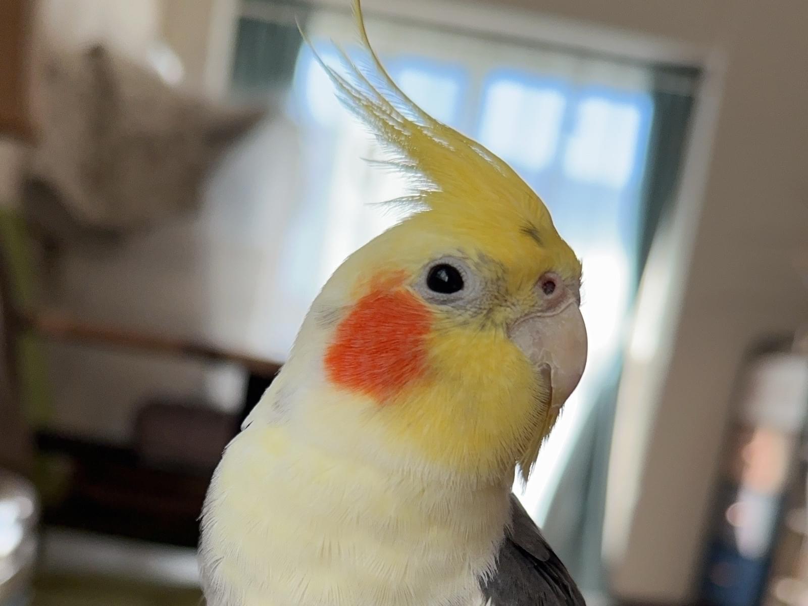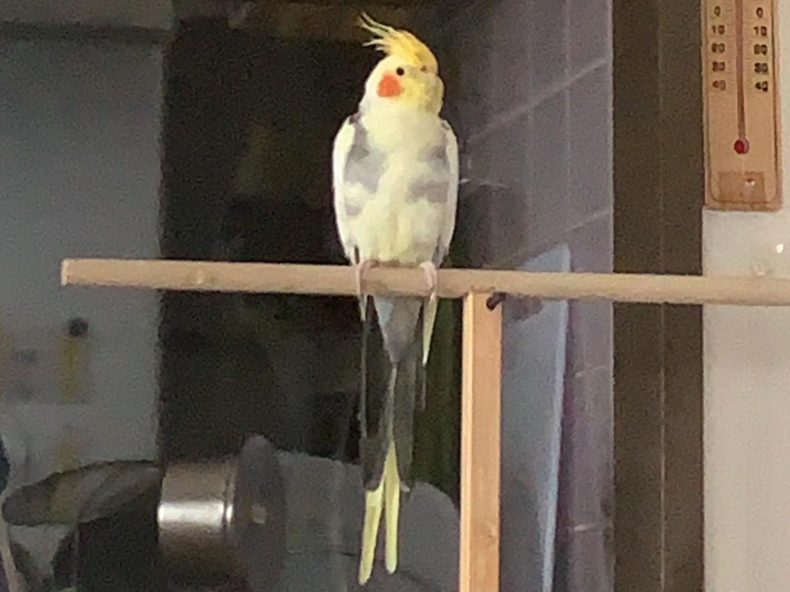 右の鼻の上に一部ほくろのようにグレーの羽が1枚はえています。左足の爪が一本白いです。