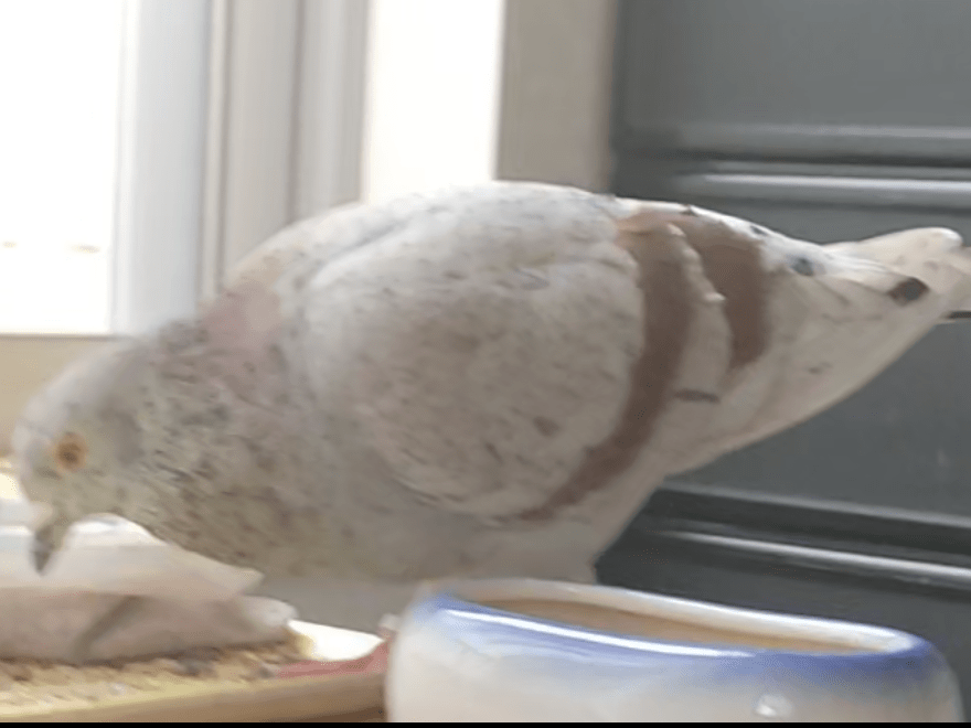 白い足輪をした鳩を探しています。色は明るいグレー(シルバー茶)で、茶色い2本線が入っています。