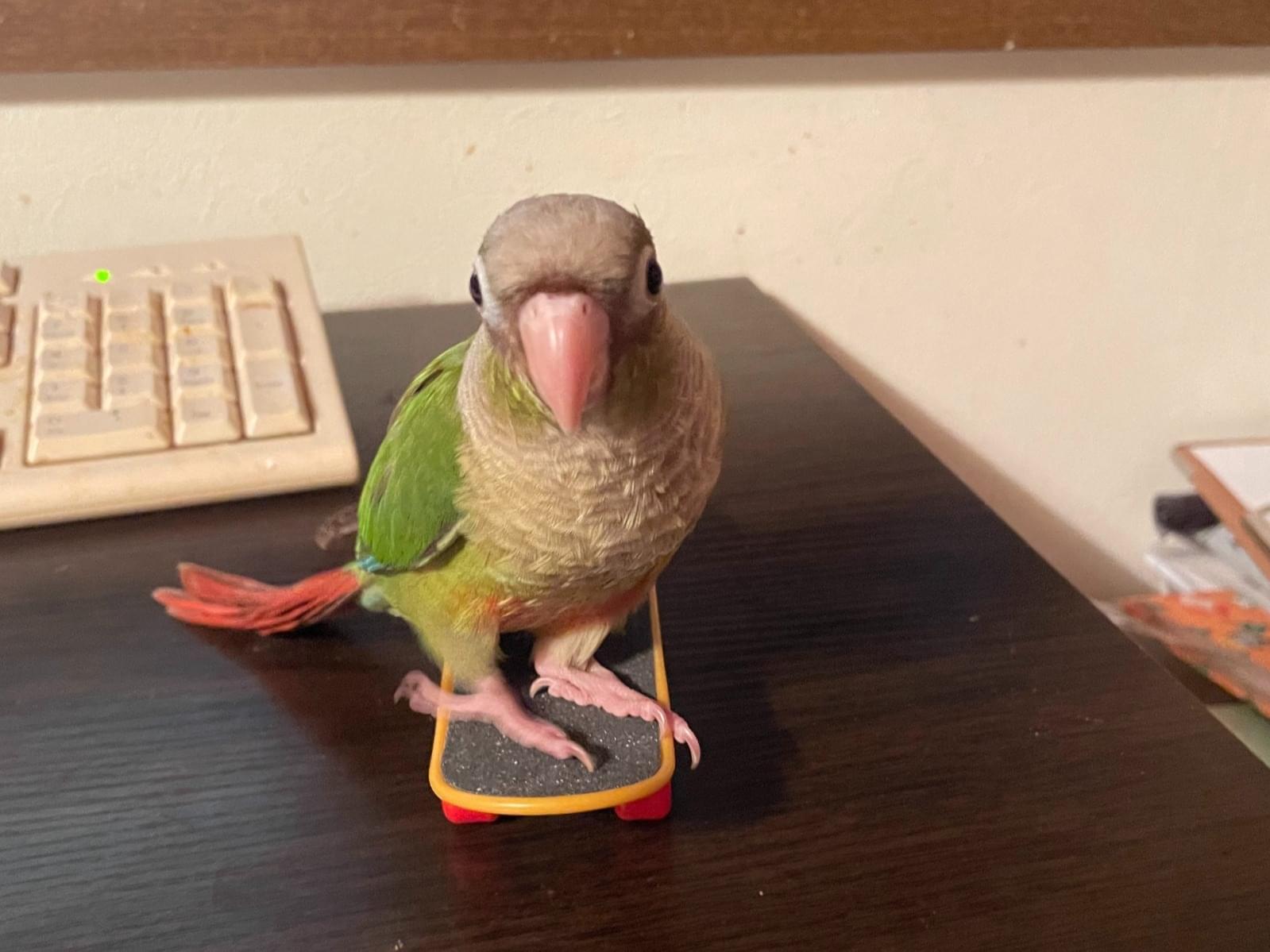 色:頭・グレー、背中・緑、尾羽・赤 ウロコインコのシナモンという種類だと思います。