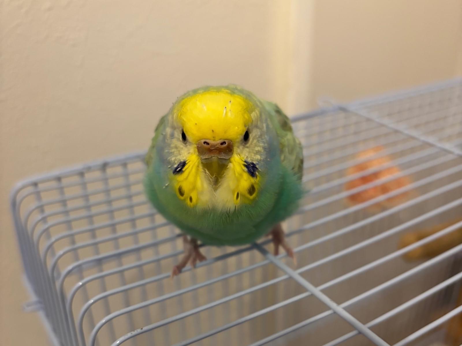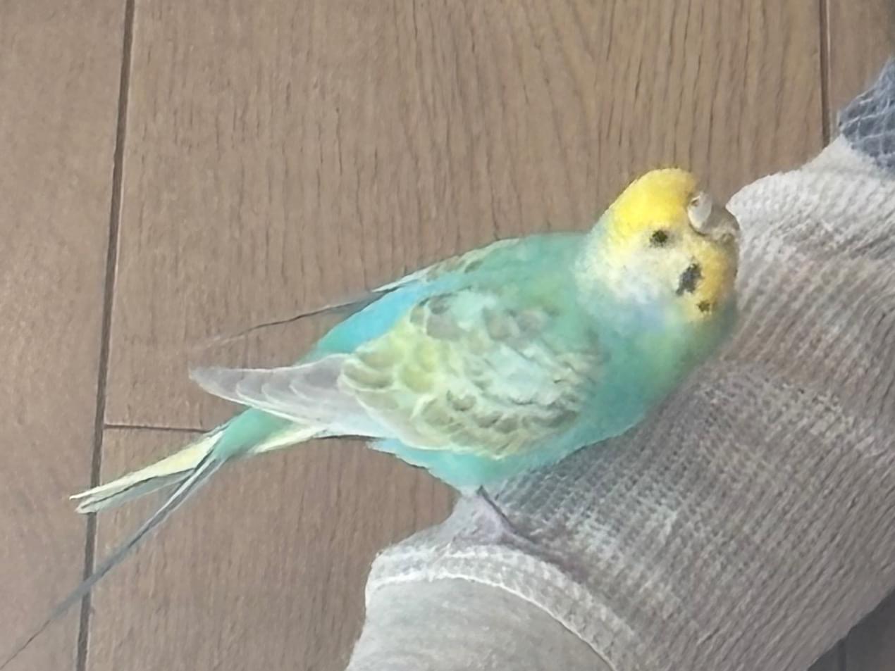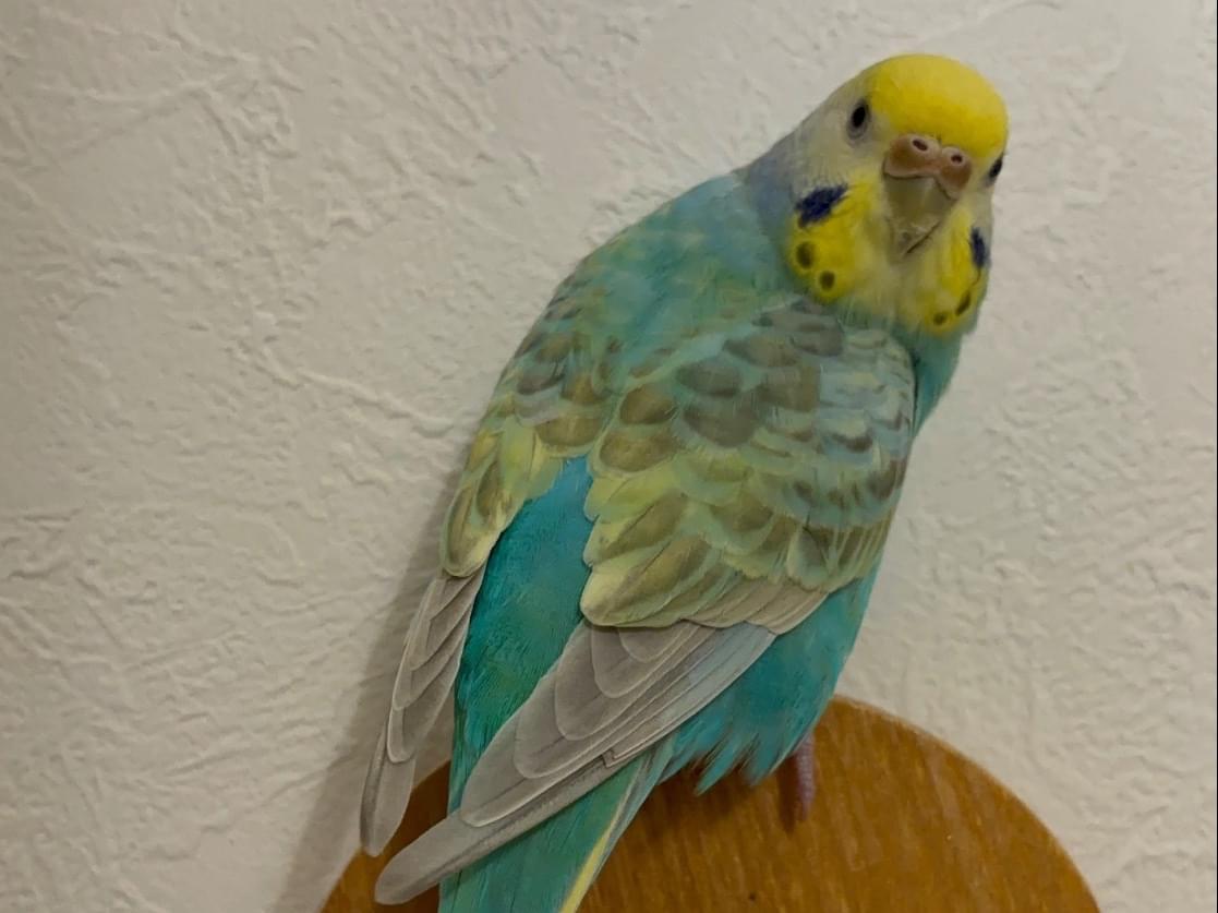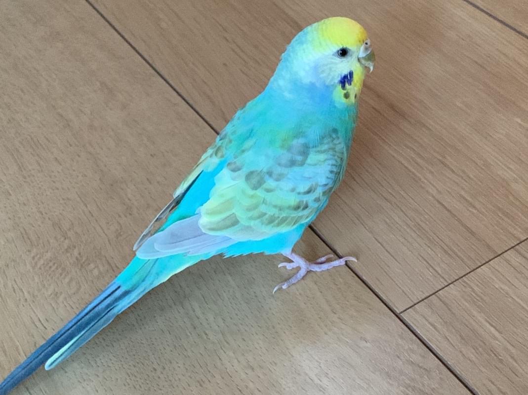 頭が黄色で身体がグリーンよりのブルーのレインボー種のセキセイインコです。