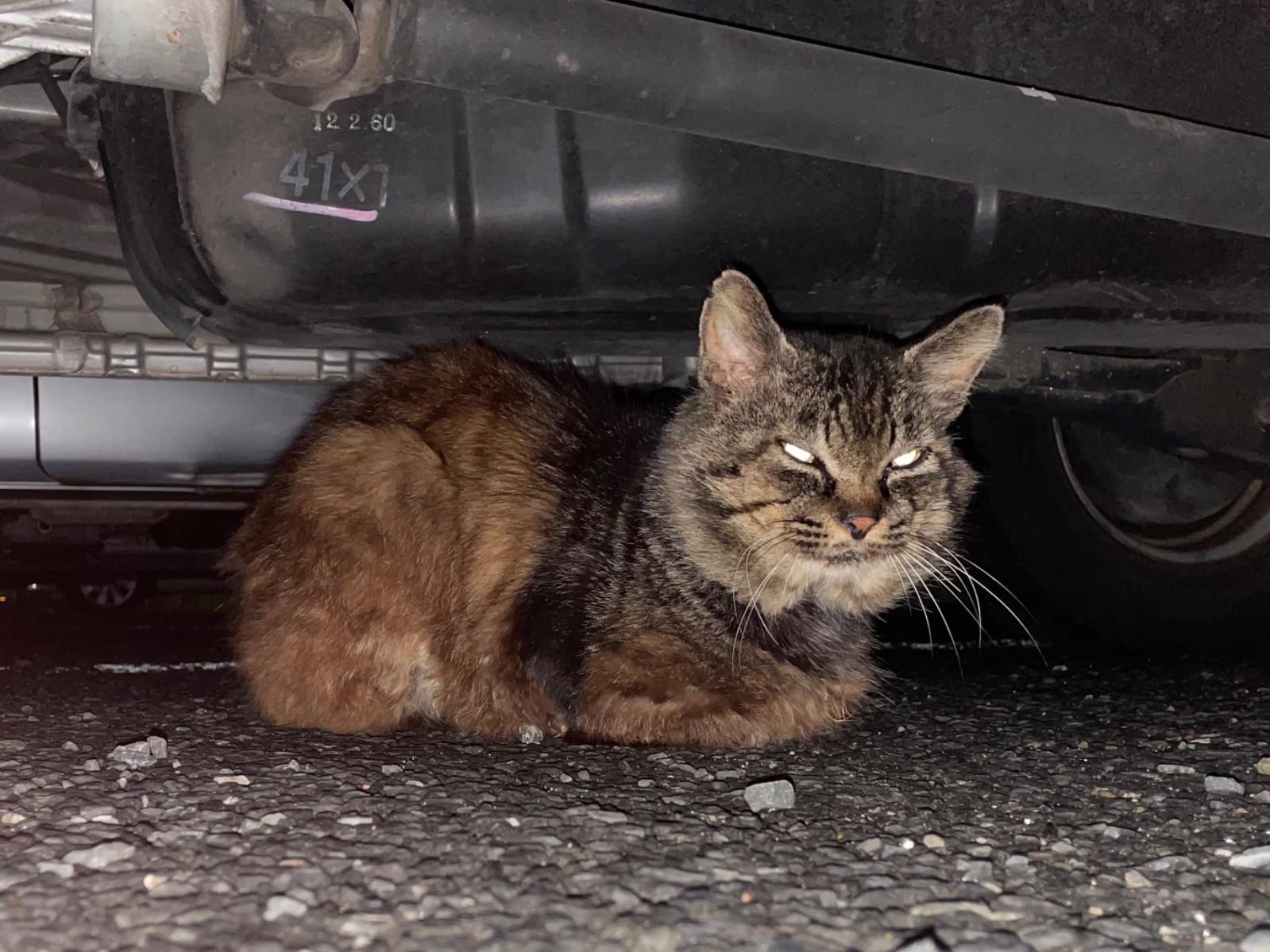 チュールをあげたらとても食いついたが、触ろうとすると少し逃げるが、車の下に長くいた。