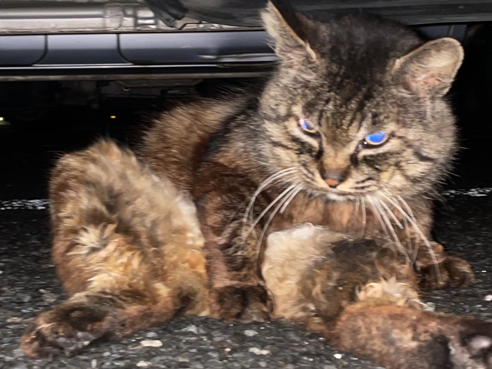 長毛で茶色のキジトラがヨボヨボと歩いてるのを見かけて、車を降りて近寄ったが逃げなかった。